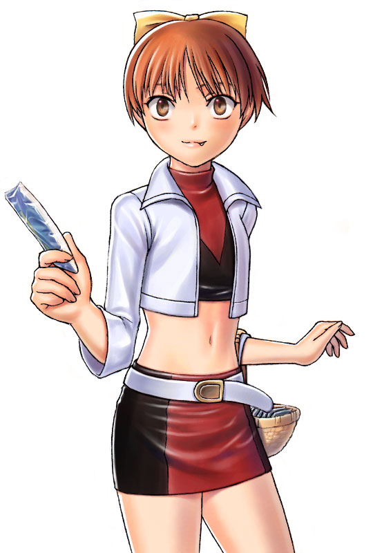 1girl :3 basket belt black_skirt bow brown_eyes brown_hair closed_mouth cowboy_shot crop_top cropped_jacket fang fang_out gegege_no_kitarou hair_bow jacket legs_apart miniskirt navel nekomusume nekomusume_(gegege_no_kitarou_5) open_clothes open_jacket red_skirt ringed_eyes short_hair simple_background skirt smile solo split_mouth standing taisai_soft turtleneck two-tone_skirt very_short_hair white_background white_belt white_jacket yellow_bow
