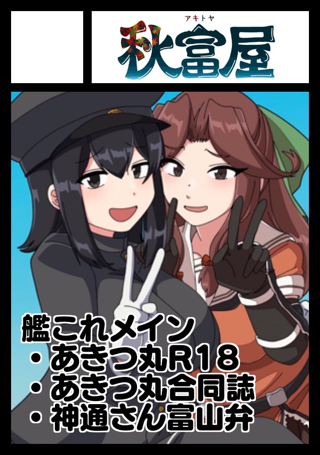 2girls akitsu_maru_(kancolle) artist_name black_gloves black_hair breasts brown_hair comiket_102 gloves jintsuu_(kancolle) k_(shiganai_shakaijin) kantai_collection large_breasts looking_at_viewer multiple_girls sailor_collar short_sleeves v