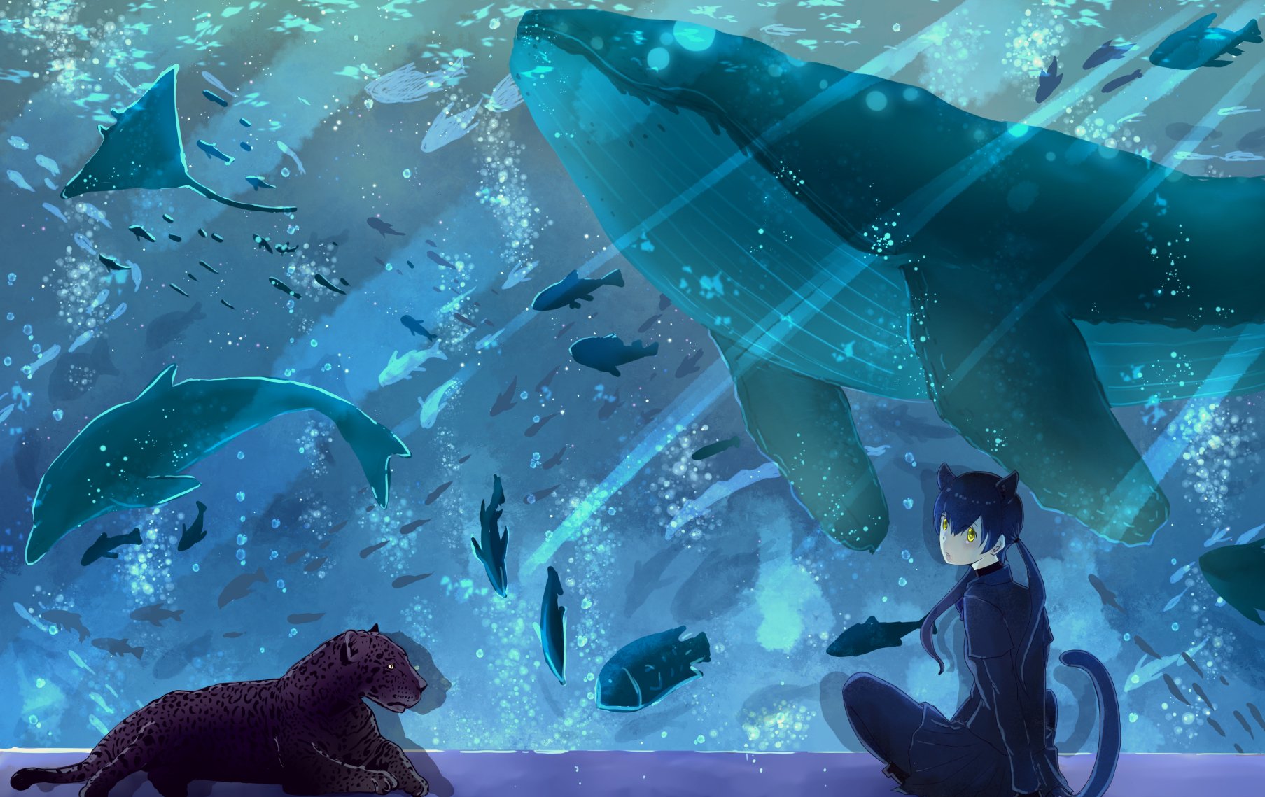 1girl animal animal_ears aquarium black_hair black_leopard_(kemono_friends) black_leotard black_shirt black_skirt blonde_hair blue_whale bodystocking creature_and_personification dolphin ena_jura fish fish_tank highres kemono_friends layered_sleeves leopard leopard_ears leopard_girl leopard_tail leotard long_hair long_sleeves looking_at_another looking_at_viewer looking_back manta_ray personification shirt short_over_long_sleeves short_sleeves silhouette sitting skirt tail twintails very_long_hair water whale yellow_eyes