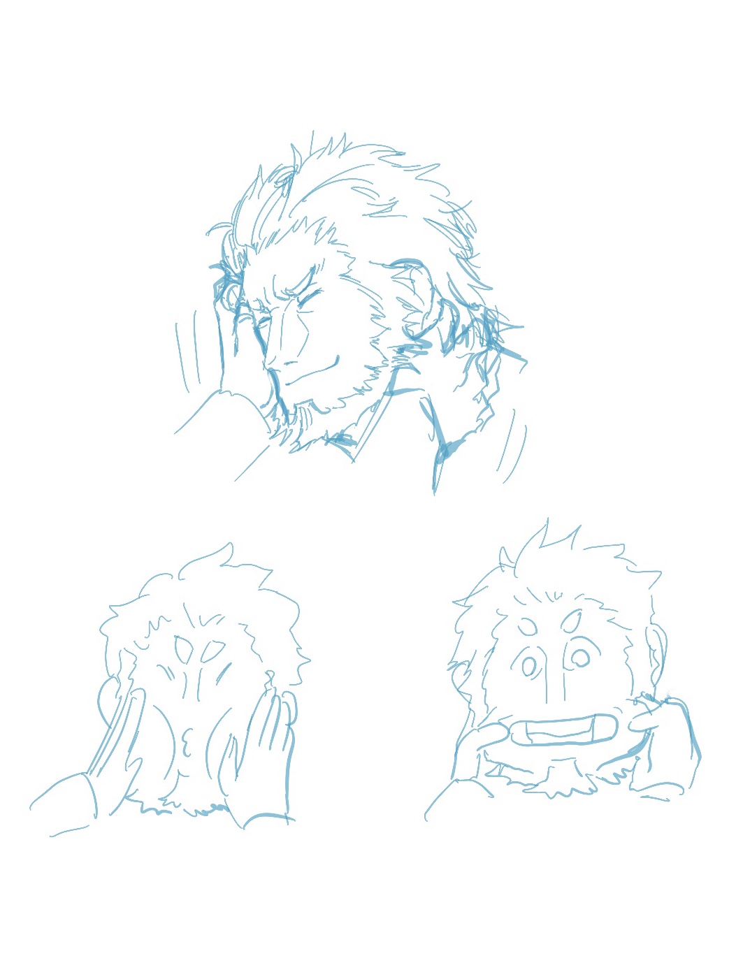 1boy bara beard caressing_cheek cheek_press cheek_pull closed_eyes cropped_shoulders empty_eyes multiple_expressions facial_hair fate/grand_order fate_(series) hand_on_another's_face happy highres iskandar_(fate) laughing male_focus mature_male monochrome motion_lines multiple_views pov_adoring shababuru short_hair thick_eyebrows