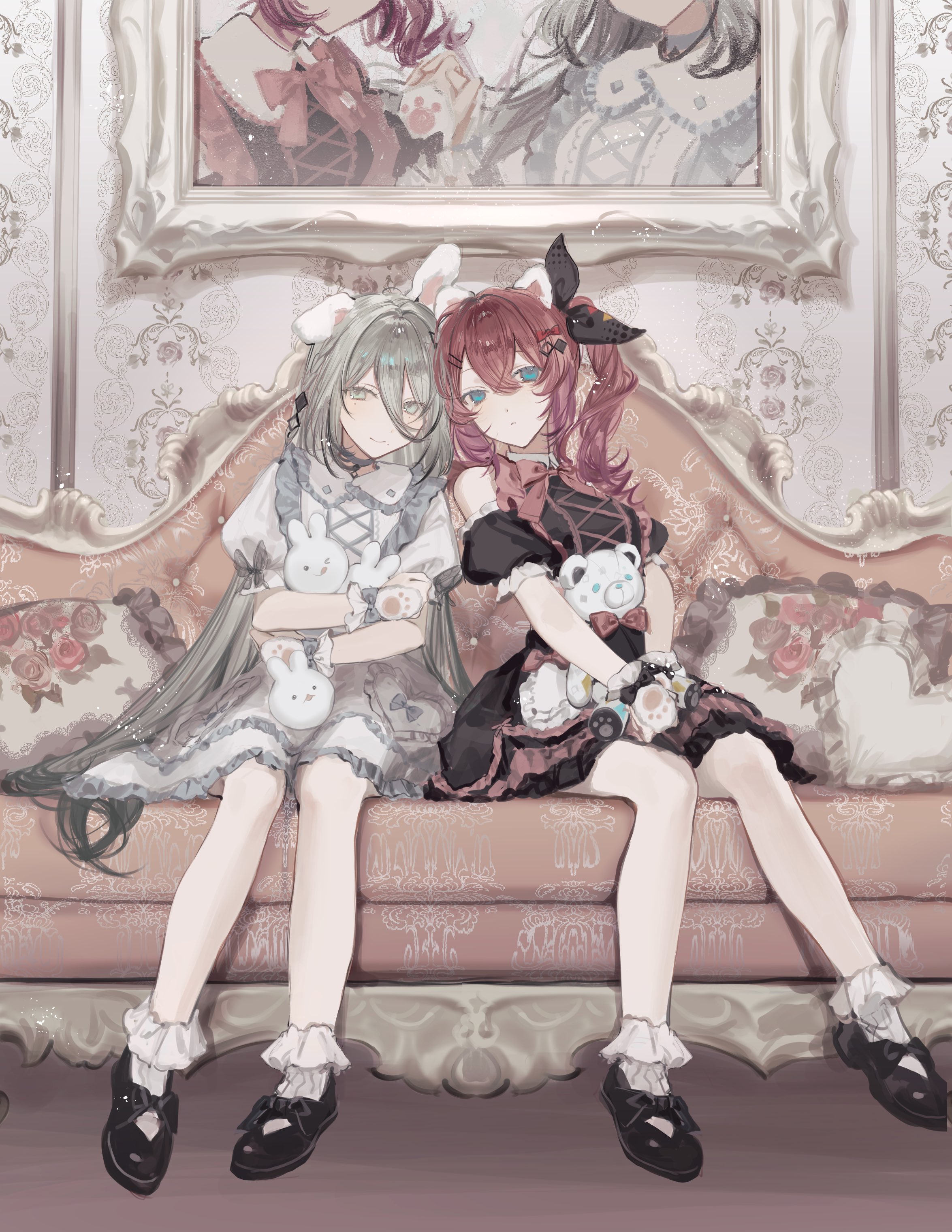 2girls absurdres animal_ears aqua_eyes black_bow black_dress black_footwear black_ribbon bow commentary couch cross-laced_clothes crossed_bangs detached_sleeves dress expressionless fake_animal_ears frilled_dress frilled_socks frills grey_eyes grey_hair hair_between_eyes hair_bow hair_ornament hair_ribbon hairclip highres juliet_sleeves kuramochi_meruto long_hair long_sleeves looking_at_viewer mary_janes mole mole_under_eye multiple_girls nijisanji hugging_object on_couch picture_frame pillow pink_bow puffy_sleeves rabbit_ears red_bow red_hair ribbon scrunchie senri_(rnd_024) shoes short_sleeves side_ponytail sidelocks sitting smile socks sophia_valentine stuffed_animal stuffed_rabbit stuffed_toy swept_bangs untranslatable_commentary teddy_bear very_long_hair virtual_youtuber wallpaper_(object) white_dress white_scrunchie white_socks