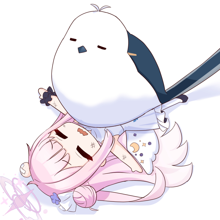 1girl 1other angel_wings armpits bird blue_archive blunt_bangs bruise chibi commentary_request defeat dress feathered_wings flower frilled_dress frills hair_flower hair_ornament hair_scrunchie halo head_bump injury long_hair looking_at_another lying mika_(blue_archive) mini_person minigirl on_back one_side_up outstretched_arms pantyhose pink_hair scrunchie shooka sidelocks simple_background size_difference sleeveless spread_arms turtleneck turtleneck_dress white_background white_dress white_pantyhose white_wings wings wrist_scrunchie