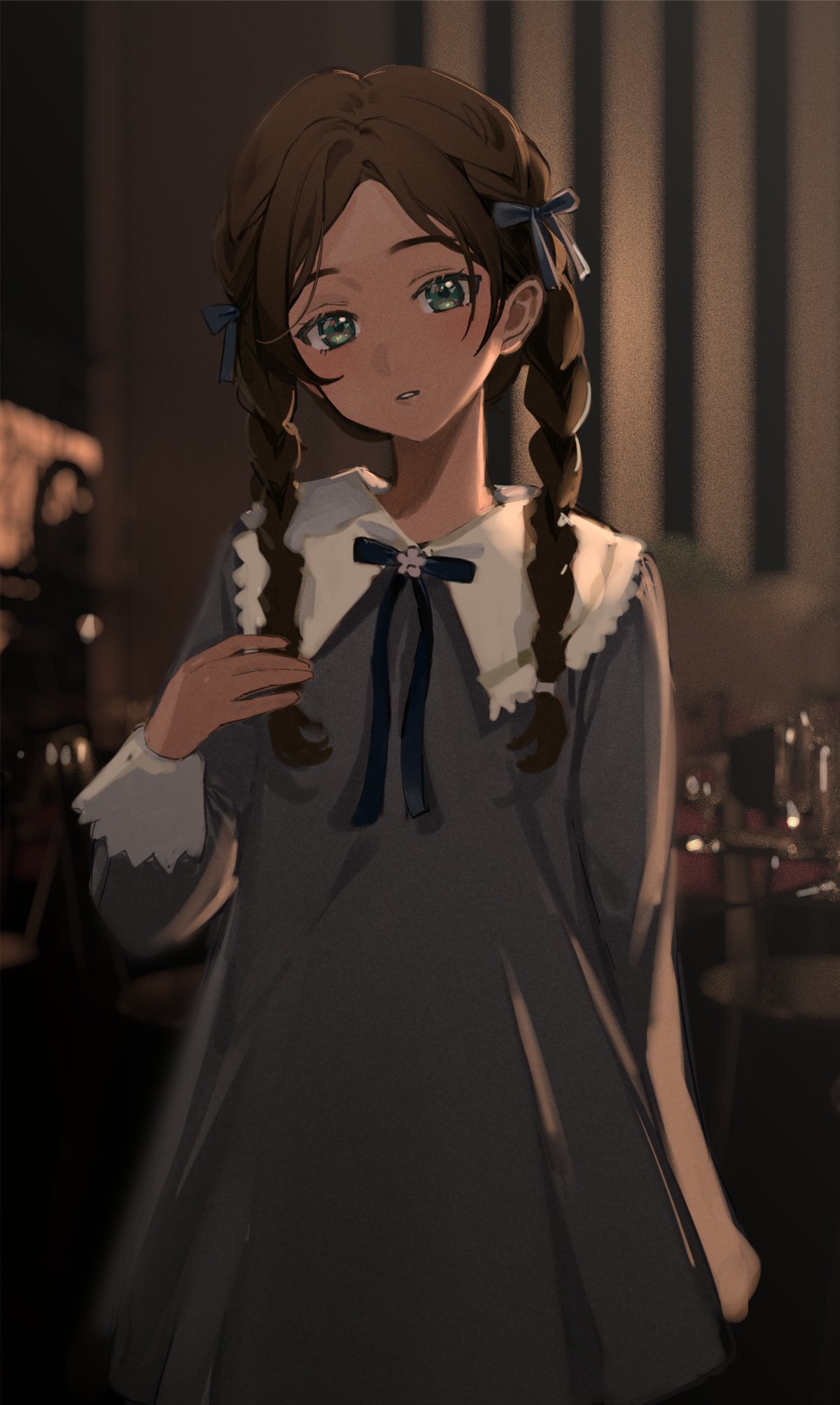 1girl aonuma_neiru blue_ribbon blurry blurry_background blush braid brown_hair dark-skinned_female dark_skin dress fei_(songyijie) green_eyes grey_dress hair_ribbon highres long_hair long_sleeves looking_at_viewer parted_lips ribbon solo twin_braids wonder_egg_priority