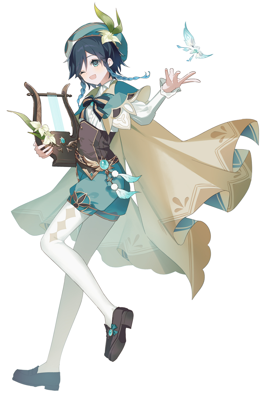 1boy bard beret black_hair blue_eyes blue_hair braid brown_footwear cape collared_cape commentary corset crystalfly_(genshin_impact) flower frilled_sleeves frills full_body genshin_impact gradient_hair green_cape green_headwear green_shorts hat hat_flower highres holding holding_instrument instrument loafers lyre multicolored_hair nekoln pantyhose shirt shoes short_hair_with_long_locks shorts simple_background standing standing_on_one_leg twin_braids venti_(genshin_impact) vision_(genshin_impact) white_background white_shirt