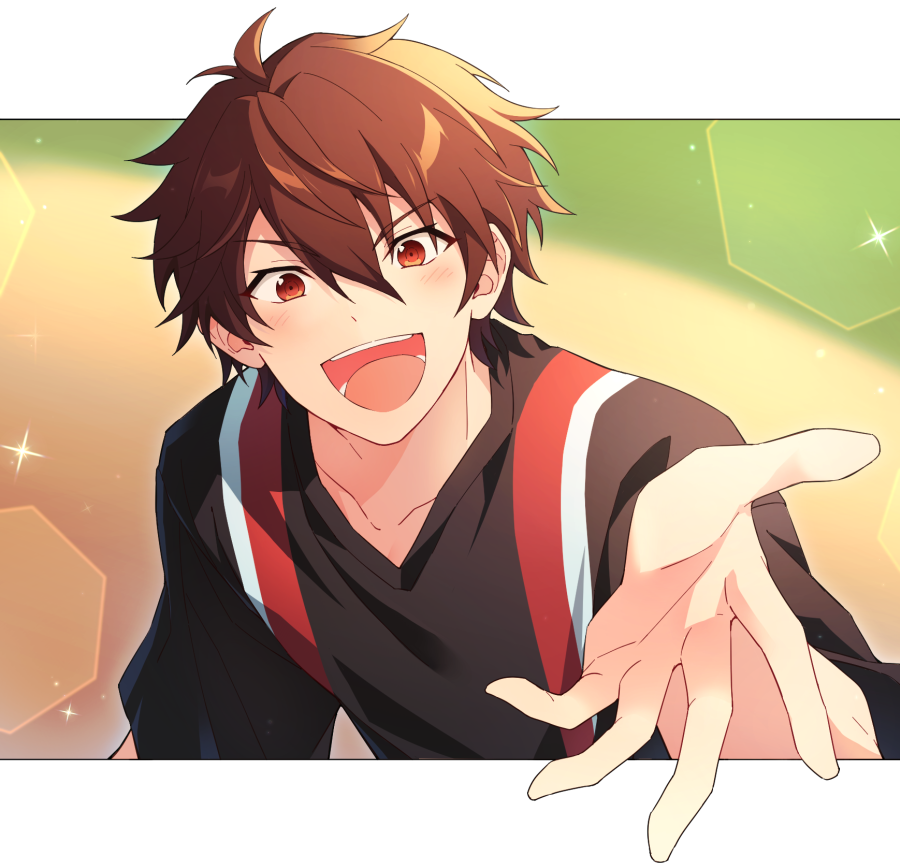 1boy brown_eyes brown_hair commentary_request ensemble_stars! hair_between_eyes korean_commentary light_blush looking_at_viewer male_focus morisawa_chiaki open_mouth outstretched_hand phewsic short_hair smile solo teeth upper_body