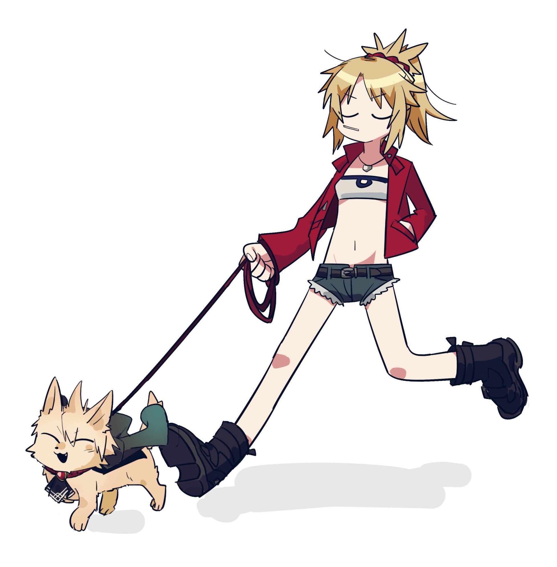 1girl animal black_footwear blonde_hair boots closed_eyes denim denim_shorts dog fang fate/apocrypha fate/grand_order fate_(series) full_body hair_ornament hair_scrunchie hand_in_pocket highres holding holding_leash hyde_(fate) jacket jekyll_and_hyde_(fate) jewelry leash mordred_(fate) mordred_(memories_at_trifas)_(fate) mouth_hold necklace open_clothes open_jacket open_mouth pet_walking ponytail red_jacket red_scrunchie scrunchie short_shorts shorts simple_background u_u uotsu_(sabakou) white_background