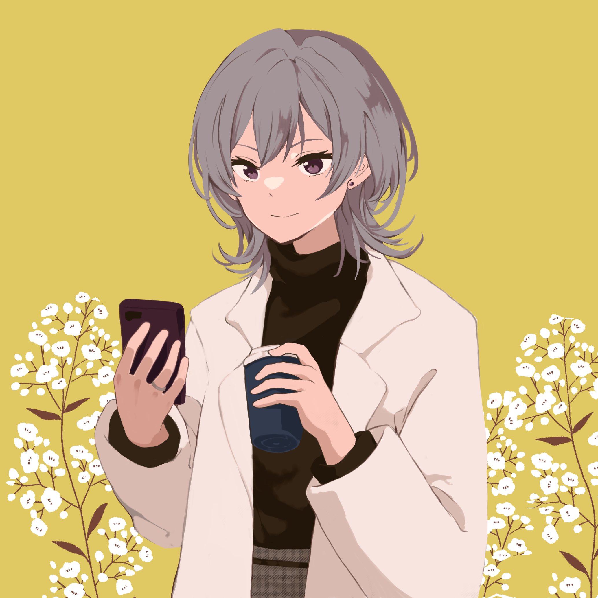 1girl black_sweater cellphone closed_mouth cup disposable_coffee_cup disposable_cup earrings flower grey_hair grey_skirt hair_between_eyes high-waist_skirt highres holding holding_cup holding_phone idoly_pride jacket jewelry kanzaki_rio long_sleeves looking_at_viewer medium_hair open_clothes open_jacket phone plaid_clothes plaid_skirt purple_eyes shirt_tucked_in sidelocks simple_background skirt smartphone smile solo stud_earrings sweater turtleneck turtleneck_sweater upper_body watanuki_(enu) white_flower white_jacket yellow_background