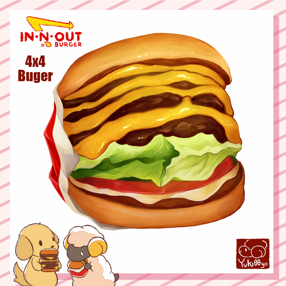 0_0 animal artist_logo artist_name black_eyes burger cheese chibi chibi_inset dog_(yuki00yo) eating food food_focus food_name holding holding_food in-n-out_burger lettuce logo mayonnaise meat no_humans original sheep_(yuki00yo) signature simple_background solid_oval_eyes tomato tomato_slice typo white_background white_eyes yuki00yo