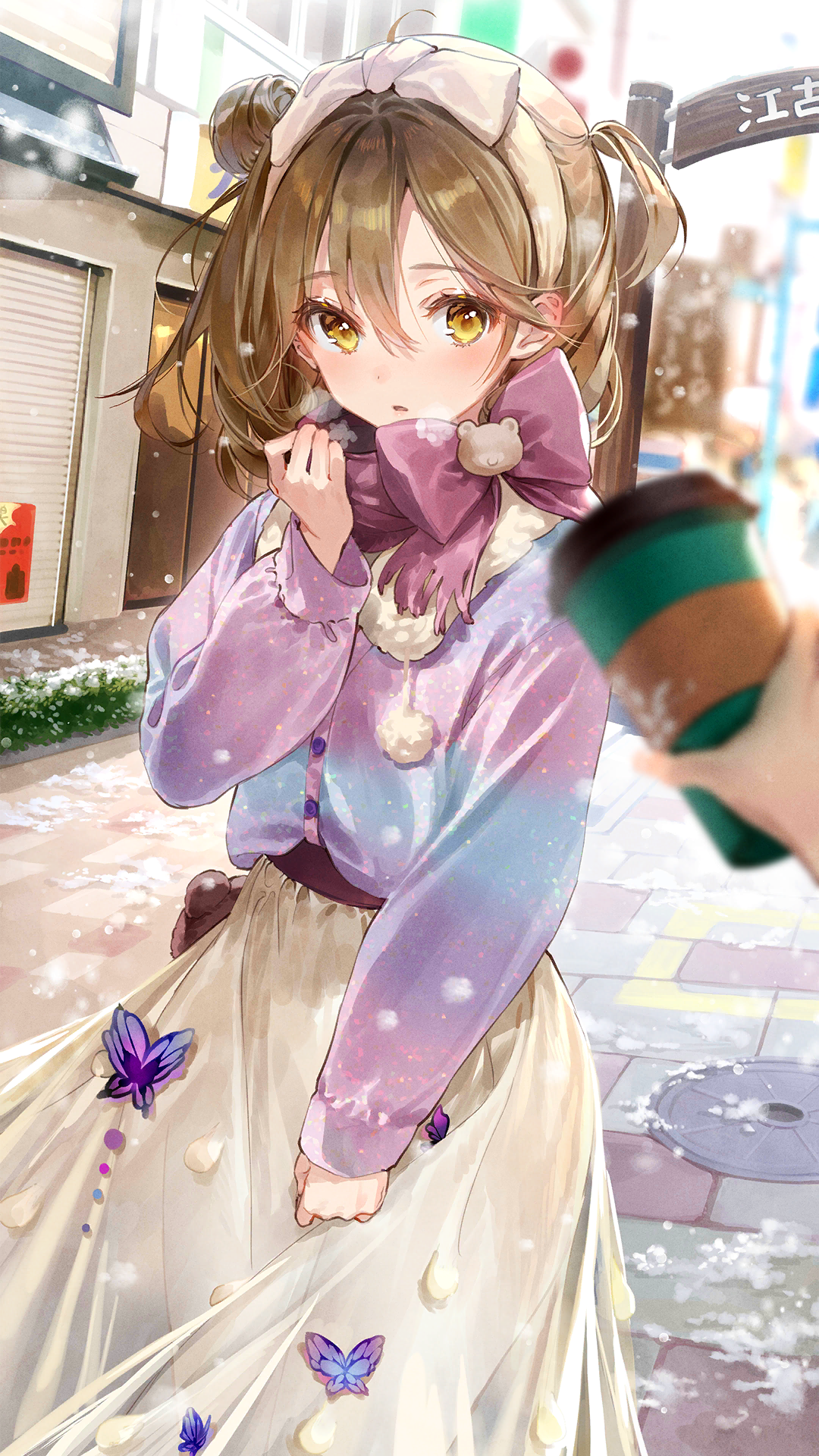 1girl :o adjusting_scarf ahoge arch blurry blurry_foreground blush bow breath brown_hair building butterfly_ornament cowboy_shot cup day disposable_cup fur-trimmed_jacket fur_trim girl_cafe_gun hair_bun hairband hand_up highres holding holding_cup jacket long_skirt long_sleeves looking_at_viewer manhole_cover medium_hair official_art one_side_up outdoors pov pov_hands purple_jacket purple_scarf purple_sweater road scarf scarf_bow sharing_food single_side_bun skirt snow snowing solo_focus stone_floor street su_xiaozhen sweater sweater_jacket white_hairband white_skirt winter yellow_eyes