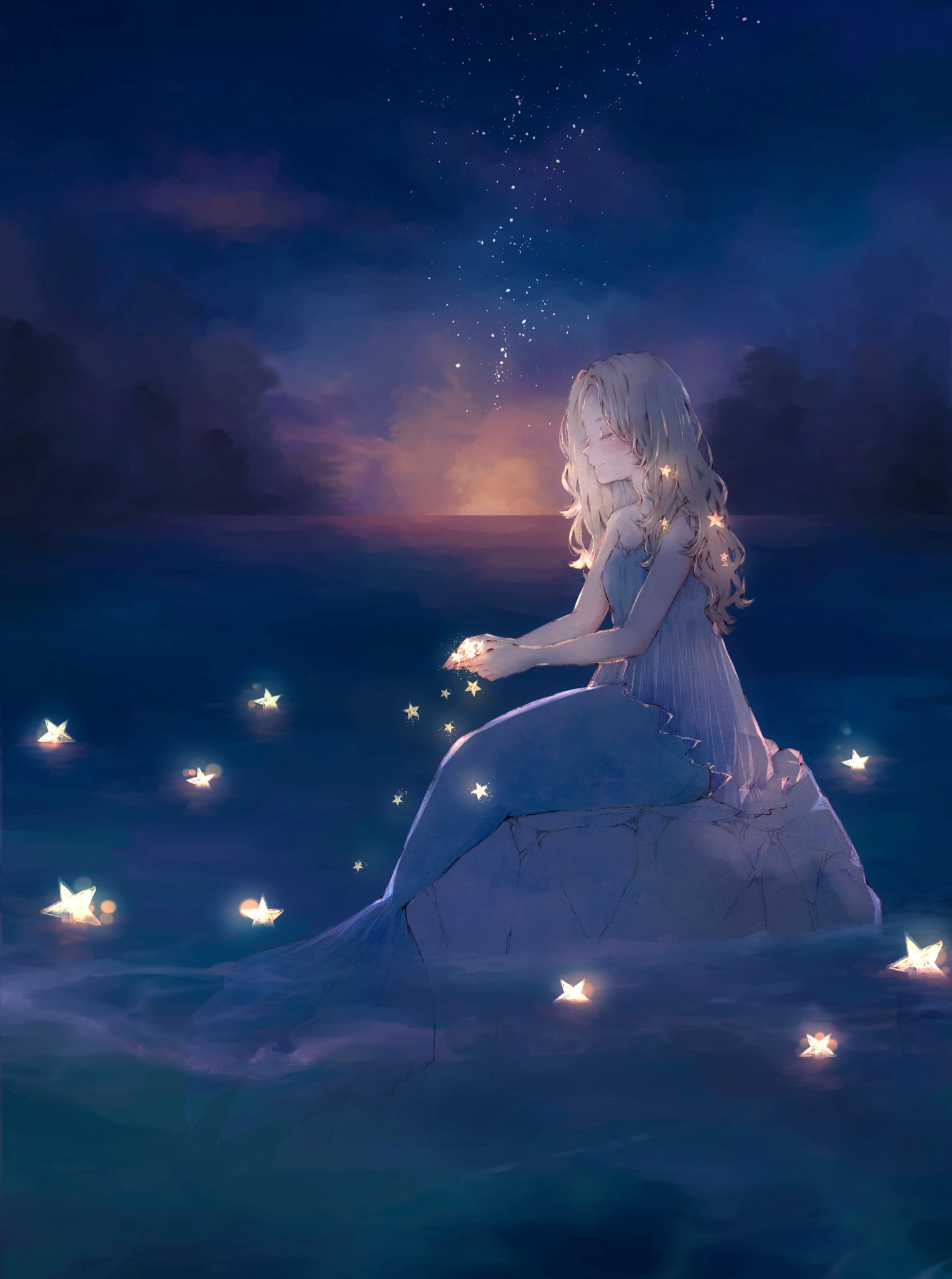 1girl anna_(k0130) bare_shoulders blonde_hair blue_shirt blush closed_eyes closed_mouth cloud cloudy_sky commentary english_commentary eyelashes hands_up highres holding holding_star horizon long_hair mermaid monster_girl night ocean on_rock original outdoors parted_bangs pleated_shirt profile rock shirt sidelocks sitting sky smile solo star_(sky) star_(symbol) starry_sky strapless strapless_shirt water wavy_hair