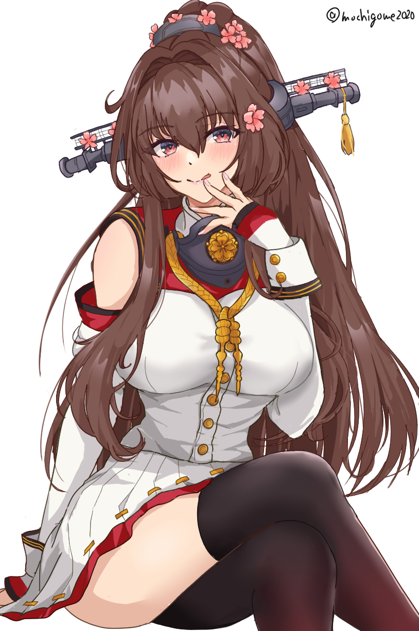 1girl :d breasts brown_eyes brown_hair chamumi_(mochiumee) cherry_blossoms coat coat_on_shoulders collar flower hair_flower hair_ornament headgear highres kantai_collection large_breasts long_coat long_hair looking_at_viewer metal_collar open_mouth ponytail sakuramon skirt sleeveless sleeveless_coat smile solo twitter_username very_long_hair white_coat white_skirt yamato_(battleship) yamato_(kancolle) yamato_kai_ni_(kancolle)