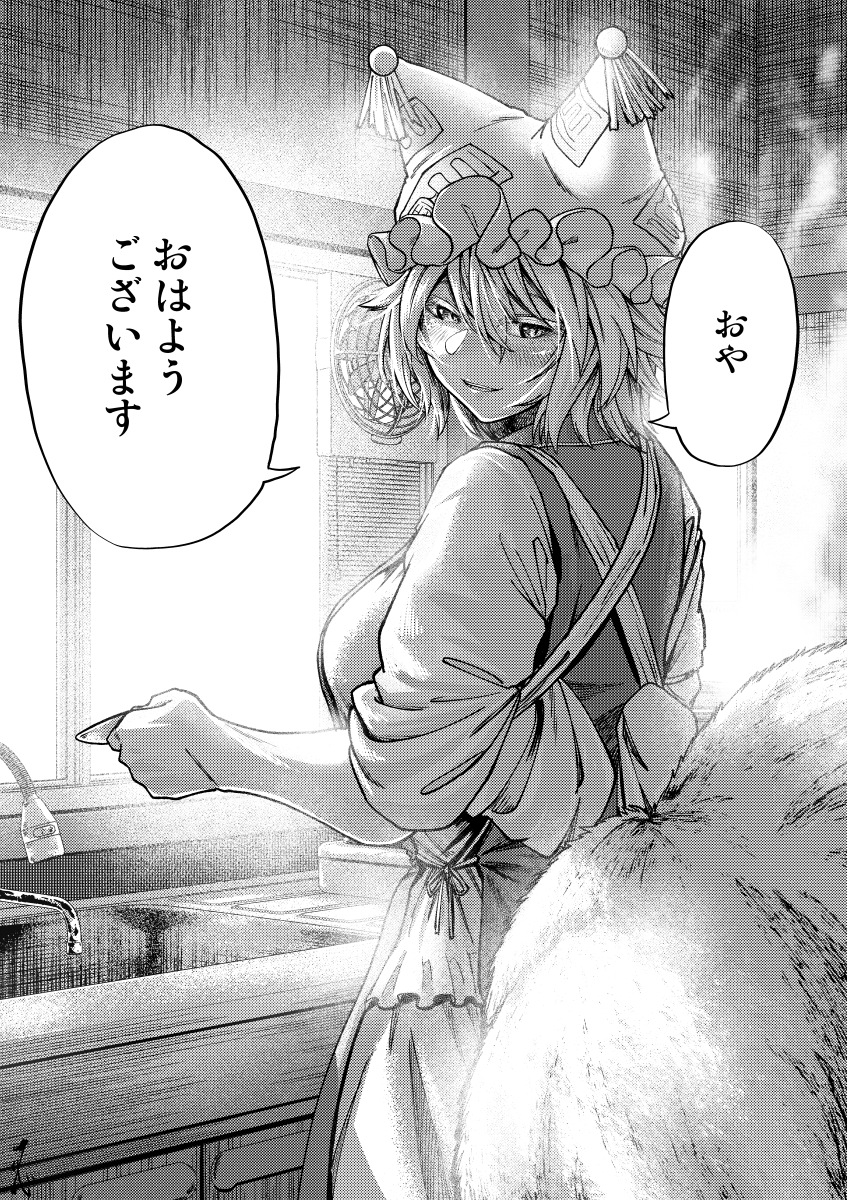 1girl animal_ears blush dress fox_ears fox_tail greyscale hair_between_eyes highres kitchen koyubi_(littlefinger1988) monochrome multiple_tails short_hair smile solo speech_bubble tabard tail touhou translation_request yakumo_ran