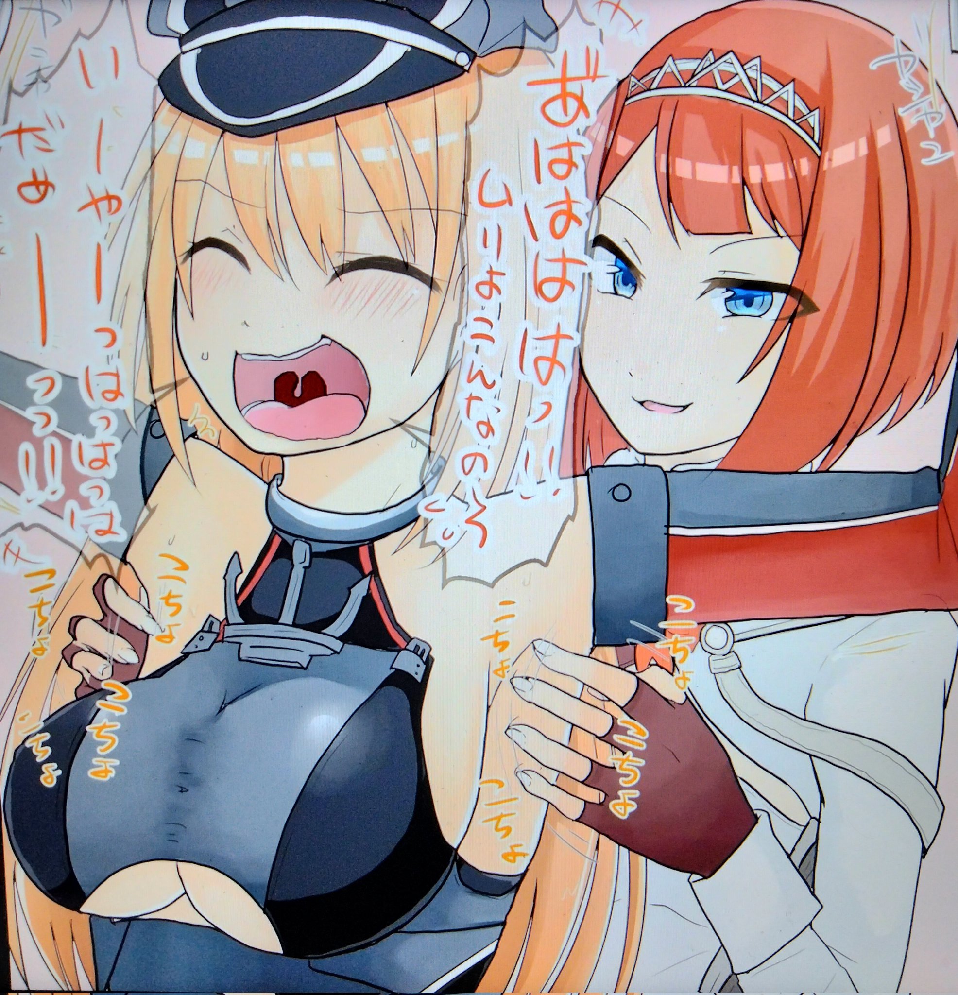 ark_royal_(kancolle) bad_link bismarck_(kancolle) breasts from_side highres medium_breasts naughty_face open_mouth sideboob sidelocks smile tickle_torture tickling tickling_armpits uvula