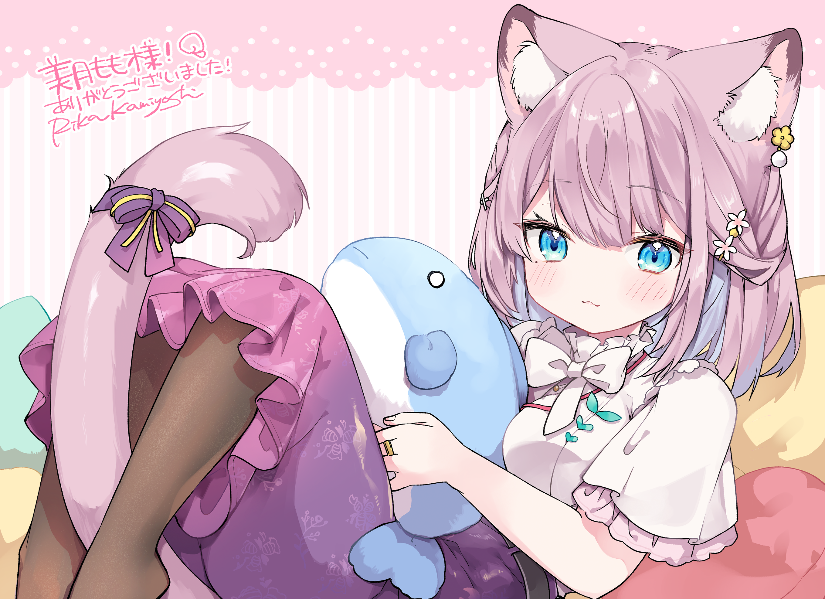 1girl :3 animal_ear_fluff animal_ears belt blue_eyes breasts cat_ears cat_girl cat_tail commission grey_hair highres indie_virtual_youtuber kamiyoshi_rika long_skirt looking_at_viewer lying medium_breasts medium_hair mitsuki_momo on_back pantyhose pillow purple_skirt shirt short_sleeves skeb_commission skirt smile stuffed_animal stuffed_toy tail virtual_youtuber white_shirt