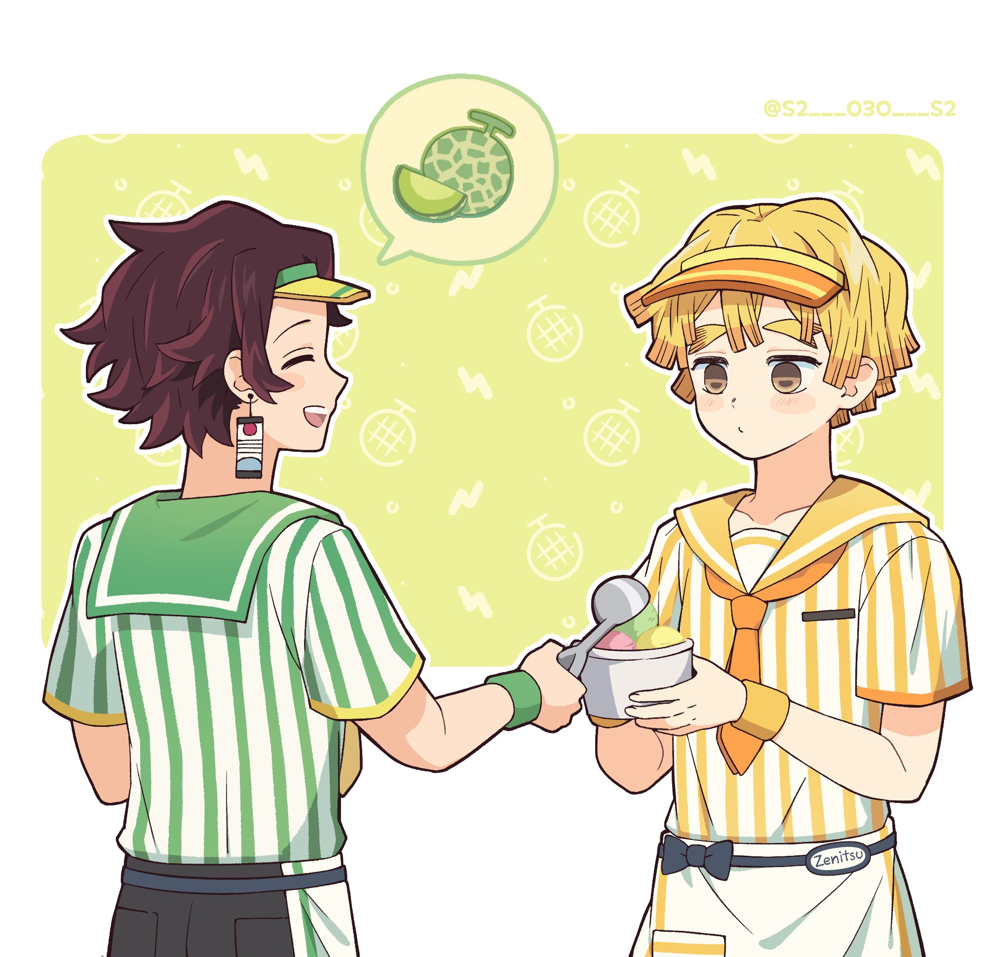 2boys agatsuma_zenitsu black_shirt blonde_hair brown_eyes closed_eyes earrings highres jewelry kamado_tanjirou kimetsu_no_yaiba male_focus multiple_boys necktie open_mouth red_hair shimya shirt short_hair spoon striped_clothes striped_shirt visor_cap wristband yellow_necktie