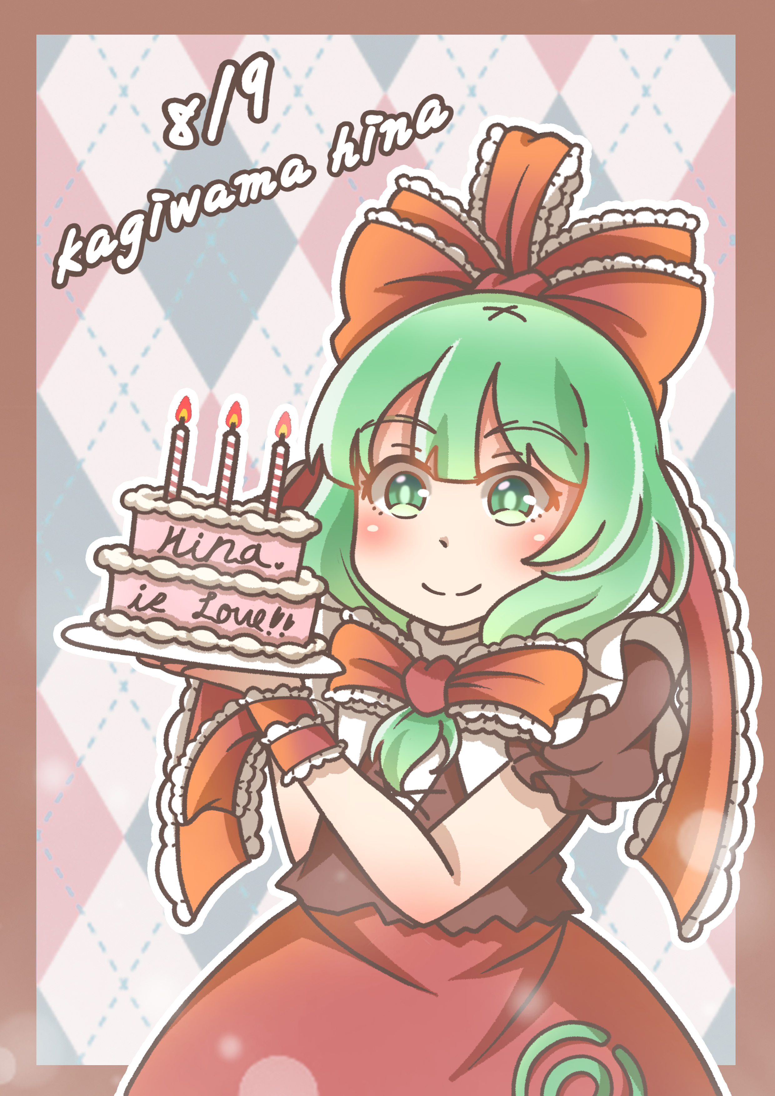 1girl absurdres argyle_background argyle_clothes arm_ribbon bow cake closed_mouth commentary_request dated english_text food frilled_ribbon frills green_eyes green_hair hat hat_bow hat_ribbon hayo_(qudtjr4682) highres holding holding_food kagiyama_hina korean_commentary looking_at_viewer red_bow red_ribbon red_skirt ribbon short_sleeves skirt smile solo touhou