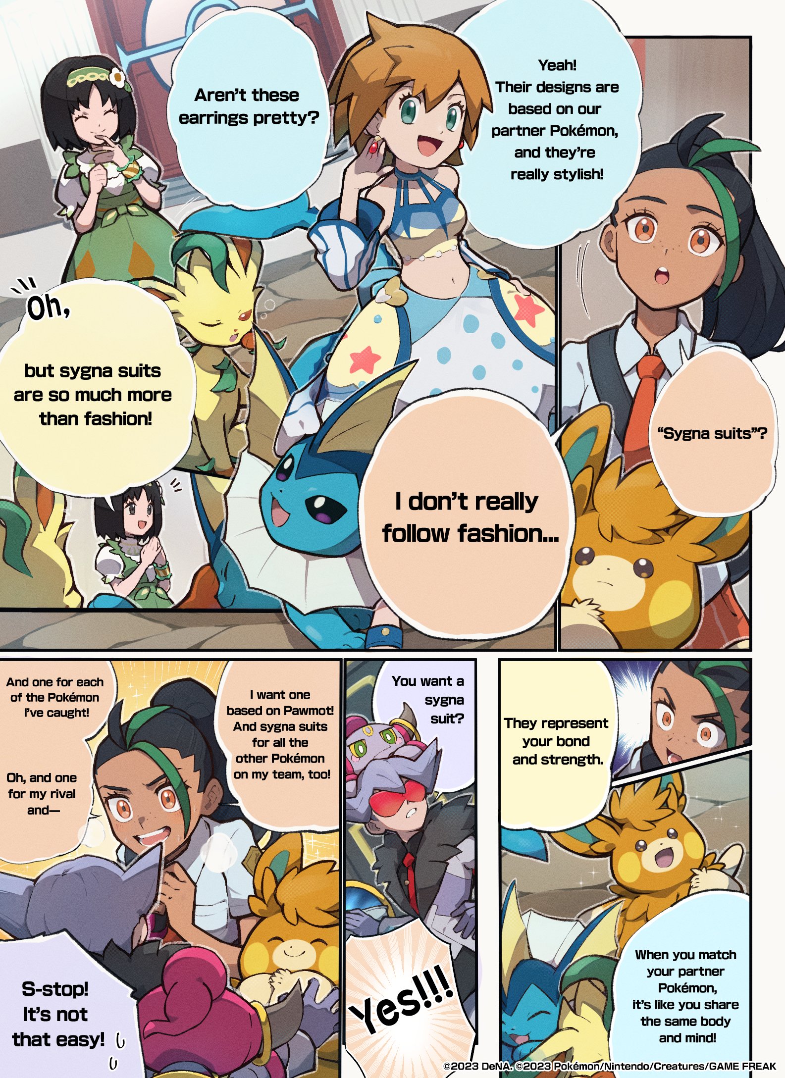 1boy 3girls black_hair clenched_hands closed_eyes comic commentary earrings english_commentary english_text erika_(pokemon) erika_(sygna_suit)_(pokemon) gen_1_pokemon gen_4_pokemon gen_6_pokemon genzou_(me_genzo) green_hair grey_hair highres hoopa hoopa_(confined) jewelry leafeon lear_(pokemon) legendary_pokemon looking_at_another midriff misty_(pokemon) misty_(sygna_suit)_(pokemon) multicolored_hair multiple_girls mythical_pokemon naranja_academy_school_uniform nemona_(pokemon) nintendo official_alternate_costume official_art open_mouth orange_eyes orange_hair pawmot pokemon pokemon_(creature) pokemon_masters_ex pokemon_scarlet_and_violet school_uniform smile sparkle speech_bubble two-tone_hair vaporeon