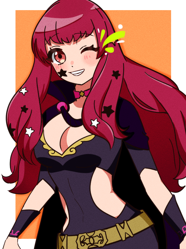 1girl ;) belt black_cape blush bodysuit cape choker clothing_cutout facial_mark fire_emblem fire_emblem_engage gmais2514 gold_belt hair_ornament long_hair looking_at_viewer nintendo one_eye_closed pink_choker red_hair side_cutout smile star_(symbol) star_facial_mark star_hair_ornament yellow_belt yunaka_(fire_emblem)
