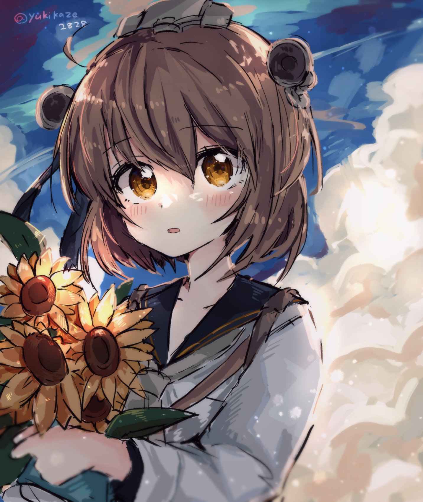 1girl blush brown_hair cloud day dress flower grey_neckerchief hair_between_eyes headgear highres holding holding_flower kantai_collection long_sleeves neckerchief orange_eyes outdoors parted_lips sailor_collar sailor_dress short_hair sky solo sunflower twitter_username upper_body white_dress yellow_flower yukikaze2828 yukikaze_(kancolle) yukikaze_kai_ni_(kancolle)