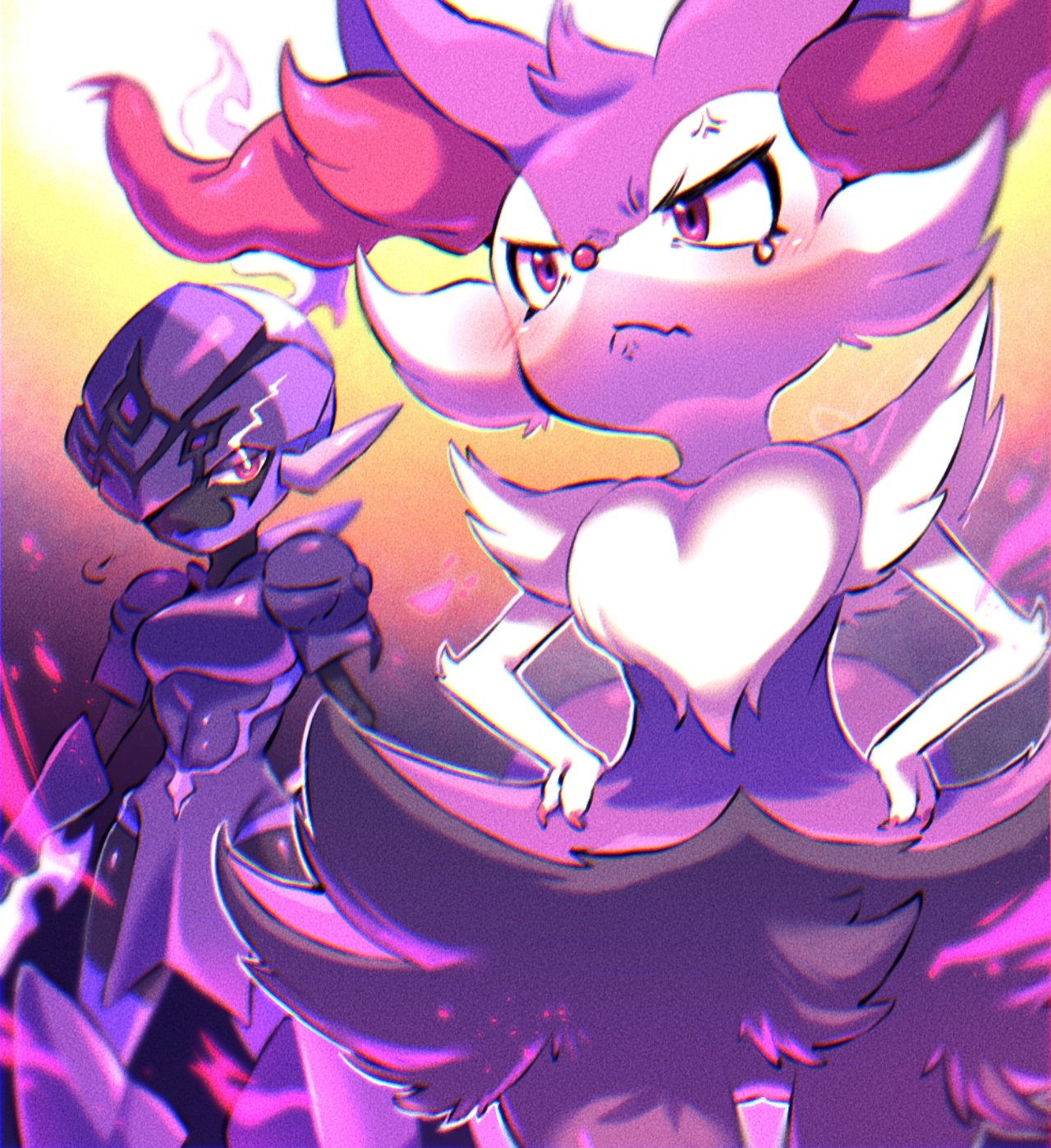 2girls :< alternate_color anger_vein angry animal_ear_fluff animal_ears animal_nose armor black_fur black_skin blurry body_fur boobplate braixen breastplate breasts bright_pupils ceruledge chromatic_aberration claws closed_mouth colored_skin cowboy_shot depth_of_field eye_trail fang female_focus fire fox_ears fox_girl fox_tail furrowed_brow furry furry_female gen_6_pokemon gradient_background half-closed_eyes hands_on_own_hips heart helmet high_ponytail highres light_trail looking_at_another multicolored_fur multiple_girls nintendo no_mouth outline pelvic_curtain pokemon pokemon_(creature) ponytail purple_armor purple_eyes purple_fire purple_fur purple_headwear s_(esumi_kihomaru) shiny_pokemon shoulder_armor simple_background skin_fang small_breasts snout standing tail tears tsundere white_fur white_hair white_outline white_pupils