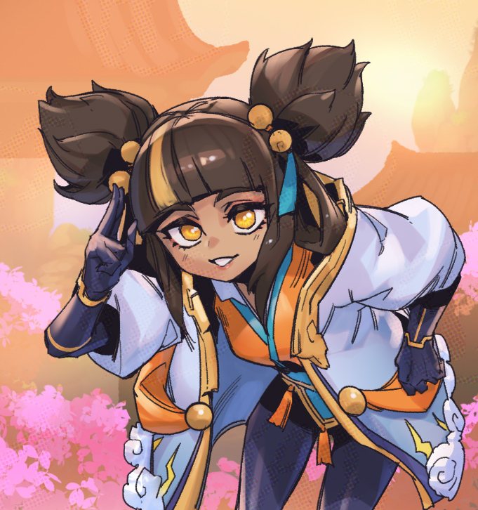1girl bent_over black_gloves black_pantyhose blonde_hair brown_hair elbow_gloves flower gloves hair_ornament immortal_journey_zeri jacket league_of_legends long_sleeves multicolored_background multicolored_hair orange_background orange_eyes pantyhose phantom_cross pink_flower ribbon smile solo streaked_hair teeth white_jacket zeri_(league_of_legends)