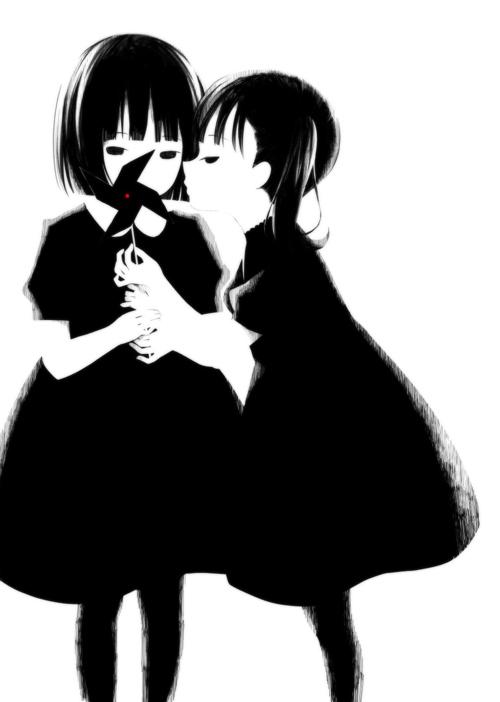2girls blowing blunt_bangs blunt_ends bob_cut collared_dress covered_mouth dress expressionless feet_out_of_frame greyscale half-closed_eyes highres holding holding_pinwheel leaning_forward long_hair looking_at_viewer looking_to_the_side monochrome multiple_girls no_lineart no_pupils original pinwheel profile puffy_short_sleeves puffy_sleeves short_hair short_sleeves simple_background standing straight-on taira_(tiririrt) twintails two-handed