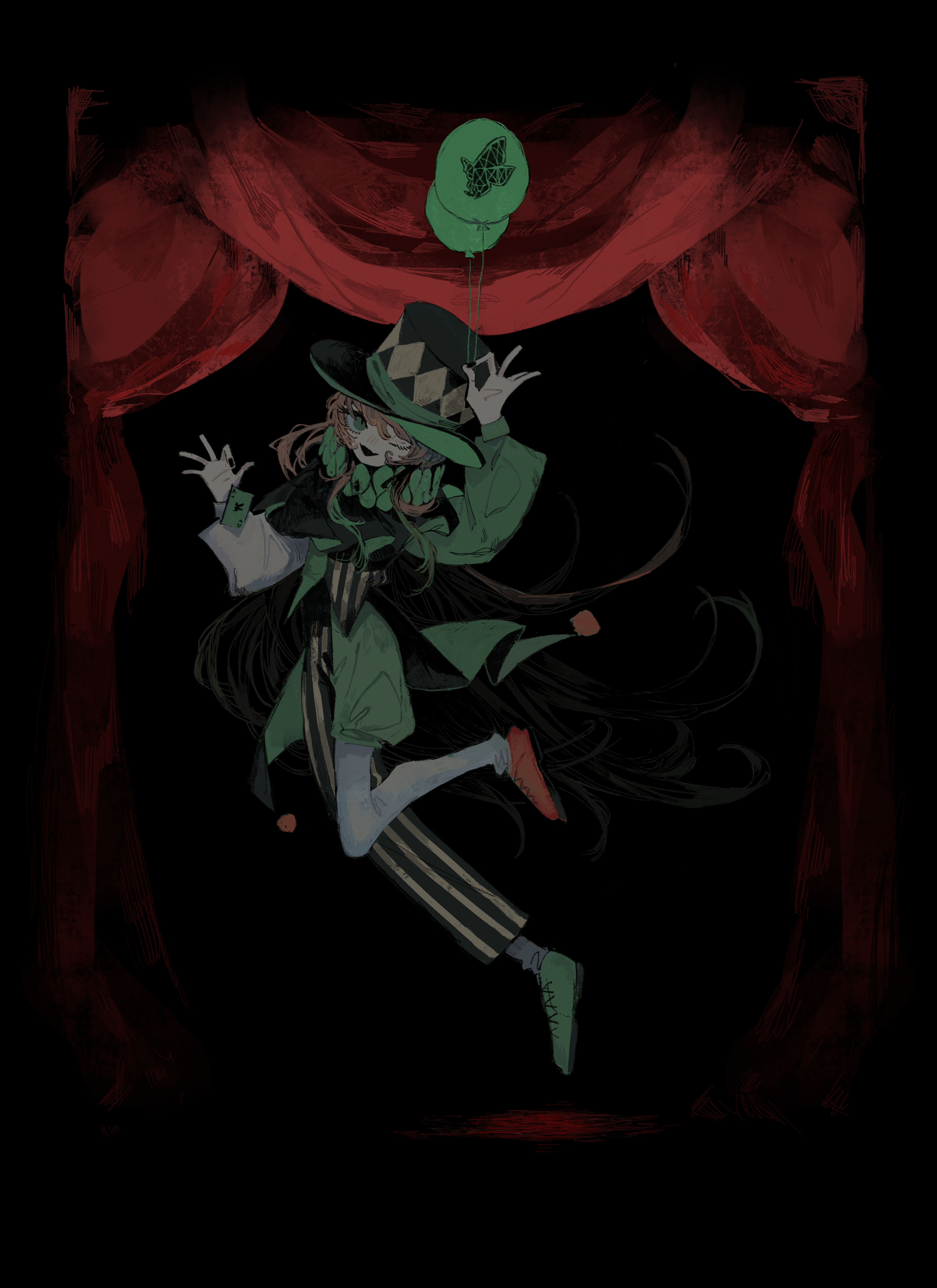 1other absurdres alternate_costume arm_up asymmetrical_clothes asymmetrical_footwear asymmetrical_legwear balloon black_border black_mouth black_nails border card coattails envy_baby_(vocaloid) fangs floating_hair foot_up full_body green_footwear green_hair green_shorts green_sleeves hand_up hat highres holding holding_balloon jumping kashitsu leggings long_hair long_sleeves melissa_kinrenka midair neck_ruff nijisanji one_eye_closed open_mouth orange_hair pants playing_card pom_pom_(clothes) puffy_long_sleeves puffy_shorts puffy_sleeves curtains shorts sidelocks skin_fangs smile solo striped_clothes striped_pants tailcoat top_hat uneven_legwear vertical-striped_clothes vertical-striped_pants very_long_hair virtual_youtuber white_leggings white_sleeves