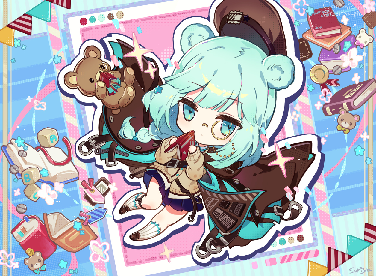 1girl animal_ears aqua_eyes aqua_hair arknights award_ribbon bare_legs bear_ears bear_girl blue_background blue_skirt book braid brown_coat brown_footwear brown_sweater chibi closed_mouth coat coat_on_shoulders commentary commission dot_mouth drop_shadow holding holding_book istina_(arknights) long_hair long_sleeves looking_at_viewer monocle multicolored_background outline pink_background pleated_skirt sidelocks signature skirt socks solo soriya string_of_flags stuffed_animal stuffed_toy sweater sweater_vest teddy_bear white_socks