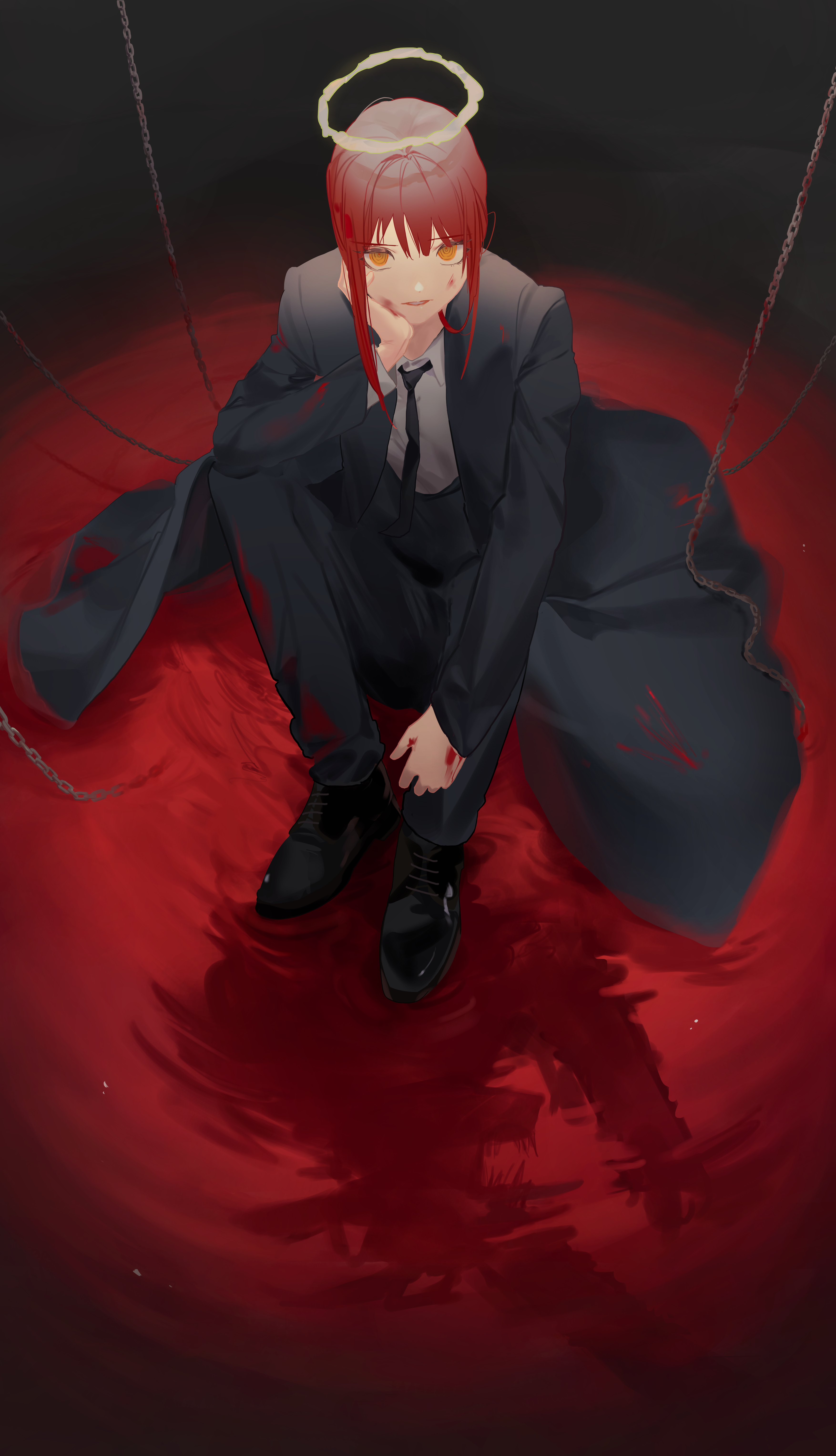 1girl absurdres arm_on_knee arm_up black_coat black_necktie black_pants black_shoes blood blood_on_clothes blood_on_face blood_on_hands blood_stain chain chainsaw_man coat collared_shirt commentary elbow_on_knee english_commentary full_body hair_between_eyes hair_intakes halo hand_on_own_face highres knees_apart_feet_together knees_up long_hair looking_at_viewer loose_necktie makima_(chainsaw_man) necktie open_clothes open_coat oxfords pants parted_bangs parted_lips pool_of_blood ringed_eyes shirt shirt_tucked_in shoes sidelocks sitting smile solo staring teeth tr_(hareru) white_shirt yellow_eyes