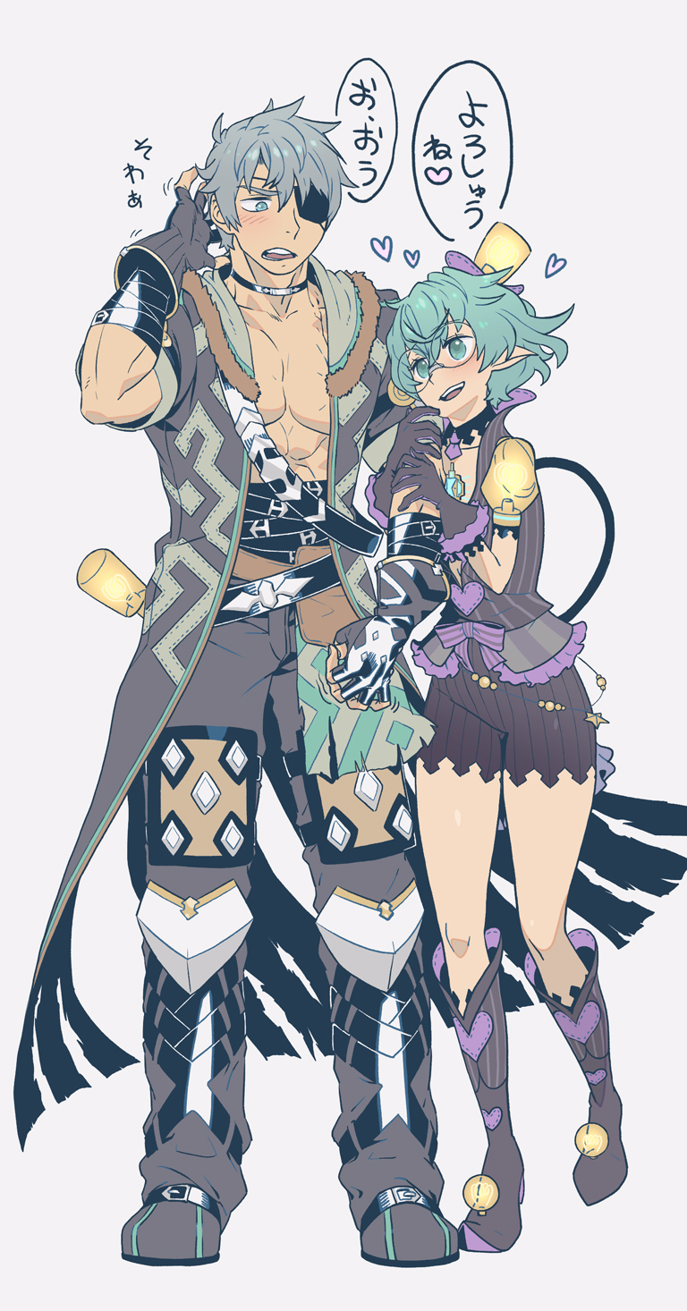 1boy 1girl :d abs arm_behind_head arm_grab black_choker black_gloves boots choker coat core_crystal_(xenoblade) eyepatch fingerless_gloves full_body glasses gloves green_eyes green_hair grey_background grey_coat grey_footwear grey_hair grey_pants heart hetero highres jacket looking_at_another muscular muscular_male natto_soup open_mouth pandoria_(xenoblade) pants pectoral_cleavage pectorals purple_footwear purple_jacket purple_shorts short_hair short_sleeves shorts smile standing tail teeth upper_teeth_only xenoblade_chronicles_(series) xenoblade_chronicles_2 zeke_von_genbu_(xenoblade)