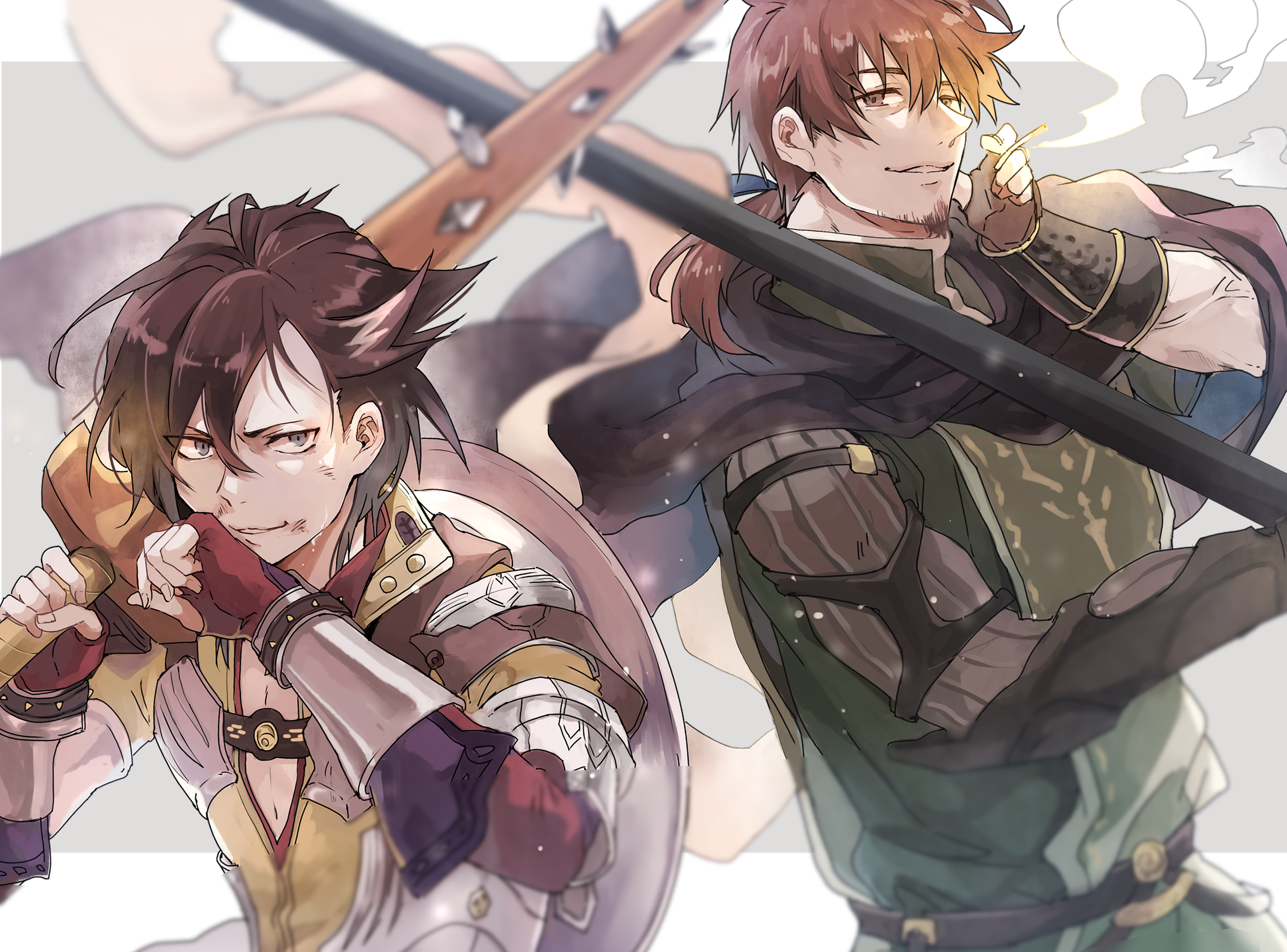 2boys black_eyes black_hair blue_ribbon brown_eyes brown_hair cigarette facial_hair fate/grand_order fate_(series) goatee hector_(fate) highres holding holding_cigarette holding_weapon low_ponytail mandricardo_(fate) manly multiple_boys over_shoulder polearm ponytail ribbon shield smoking spear sword tumikilondon5 weapon weapon_over_shoulder wiping_face wooden_sword