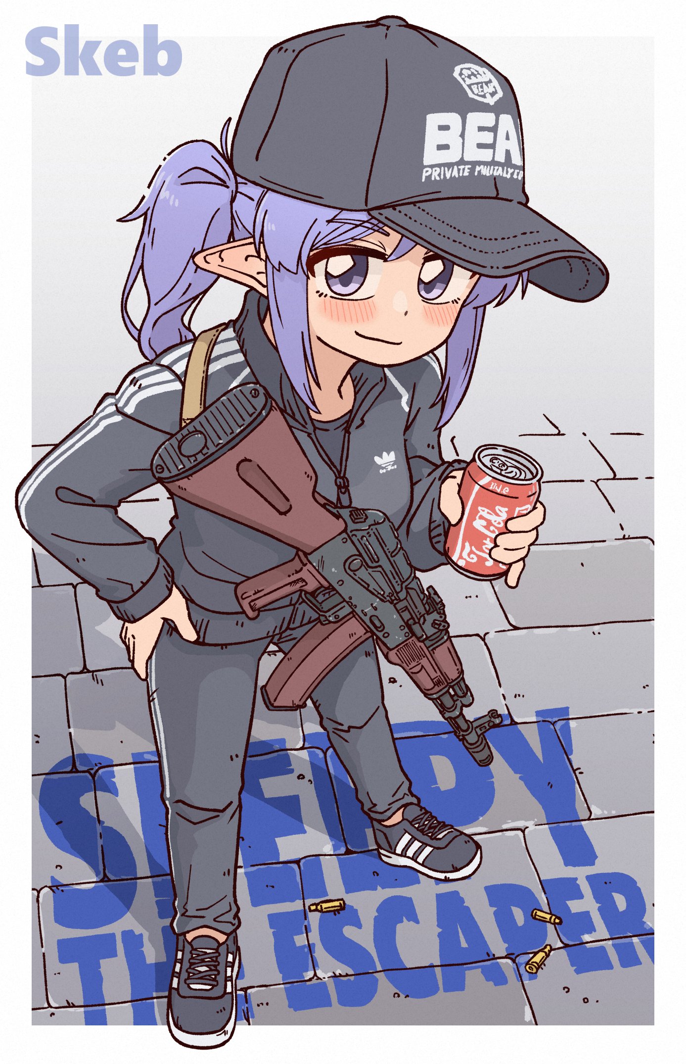 1girl adidas baseball_cap blush bocchi-ya-nawi brick_road can coca-cola commission drink drink_can elf graffiti hat highres holding holding_drink kalashnikov_rifle original pointy_ears purple_eyes purple_hair shell_casing shoes skeb_commission sneakers soda_can solo track_suit