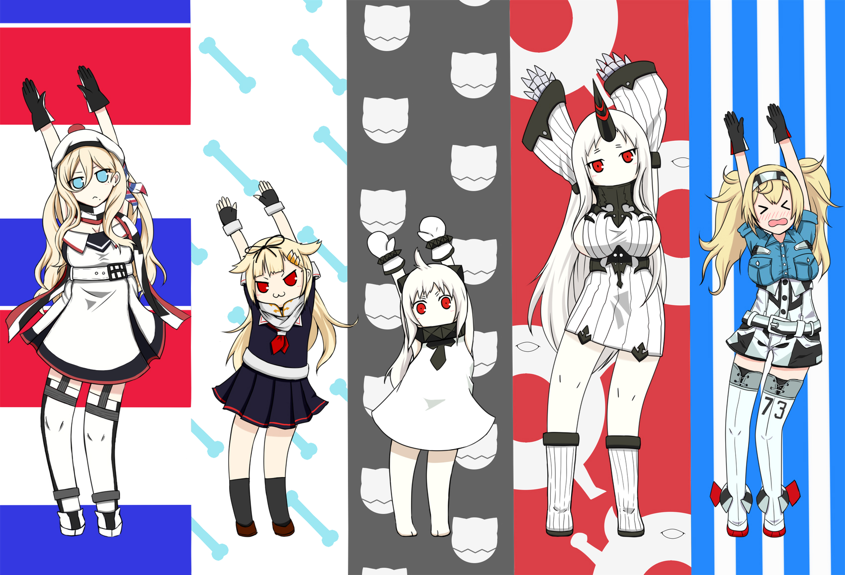 >_< 4girls abyssal_ship beret black_serafuku blonde_hair braid breasts colored_skin covered_mouth dress french_flag gambier_bay_(kancolle) gloves hair_between_eyes hat highres horns huge_breasts kantai_collection kobayashi-san_chi_no_maidragon large_breasts medium_breasts mittens multicolored_clothes multiple_girls northern_ocean_princess parody ribbed_dress richelieu_(kancolle) scarf school_uniform seaport_princess serafuku single_braid single_horn style_parody thighhighs two-tone_gloves white_dress white_hair white_mittens white_scarf white_skin yakuto007 yuudachi_(kancolle)
