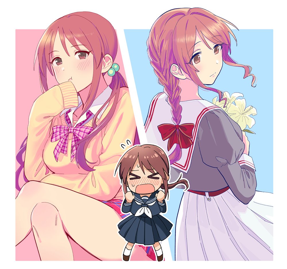 >_< 1girl :t alternate_hairstyle belt black_sailor_collar black_serafuku black_shirt black_skirt blush border bow bowtie braid braided_ponytail breasts brown_belt brown_eyes brown_footwear brown_hair cardigan chibi clenched_hands closed_mouth collarbone crossed_legs dot_nose embarrassed flower flying_sweatdrops from_behind full_body green_bow grey_shirt hair_bobbles hair_bow hair_ornament hair_ribbon hands_up holding holding_flower idolmaster idolmaster_cinderella_girls idolmaster_cinderella_girls_starlight_stage invisible_chair large_breasts loafers long_hair long_sleeves looking_at_viewer looking_back mifune_miyu momose_(oqo) multiple_views neckerchief open_mouth pink_bow pink_bowtie plaid_bow plaid_bowtie plaid_clothes plaid_skirt pleated_skirt ponytail puffy_long_sleeves puffy_sleeves red_ribbon red_skirt ribbon sailor_collar school_uniform serafuku shirt shoes sidelocks simple_background sitting skirt sleeves_past_fingers sleeves_past_wrists socks standing sweat two-tone_background white_border white_flower white_neckerchief white_sailor_collar white_shirt white_skirt white_socks yellow_cardigan