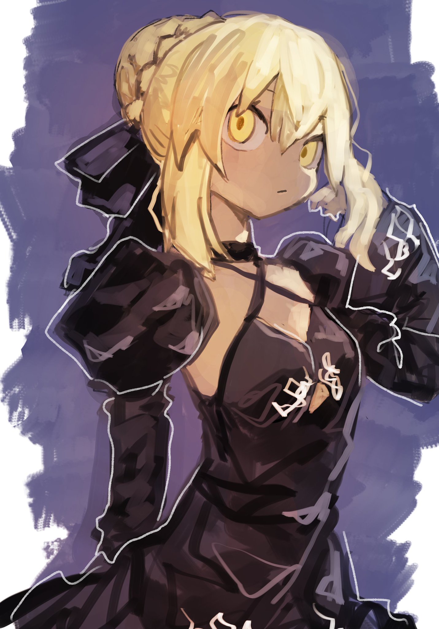 1girl artoria_pendragon_(fate) black_bow black_choker black_dress blonde_hair blue_background bow braid breasts bun_with_braided_base choker closed_mouth dress fate/stay_night fate_(series) hair_bow hair_bun hand_up highres juliet_sleeves long_sleeves looking_at_viewer puffy_sleeves saber_alter saber_alter_(third_ascension) shikemoku short_hair sidelocks single_hair_bun small_breasts solo two-tone_background upper_body white_background yellow_eyes