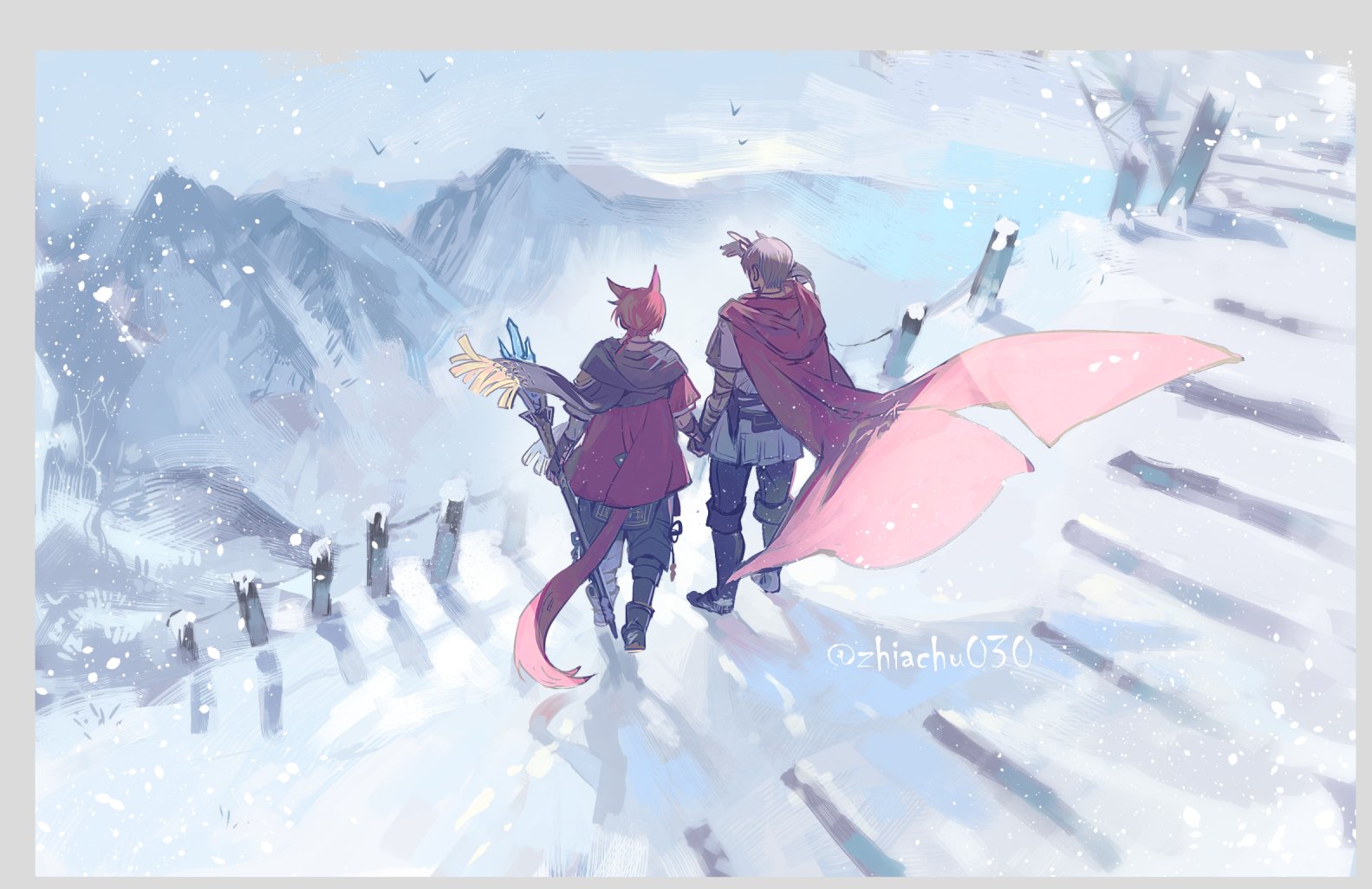 2boys adventurer_(ff14) animal_ears arm_wrap black_footwear black_pants blue_sky boots border brown_gloves brown_hair brown_scarf cape cat_boy cat_ears cat_tail day elbow_gloves facing_away final_fantasy final_fantasy_xiv fingerless_gloves floating_cape fringe_trim from_above g'raha_tia gloves grey_jacket hand_up holding holding_hands holding_staff hyur jacket jushenger knee_boots low_ponytail male_focus miqo'te mountain multiple_boys outdoors pants ponytail railing red_cape red_hair red_jacket scarf scenery short_hair short_ponytail sky snow snowing staff standing tail warrior_of_light_(ff14) wide_shot wind wooden_railing yaoi yellow_border