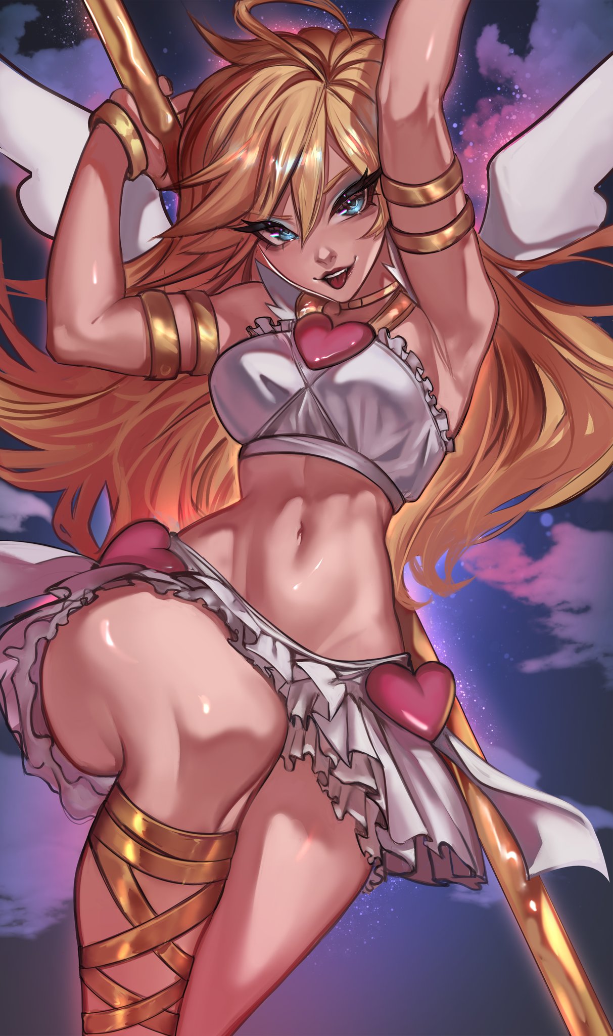 1girl angel_wings armband arms_up blonde_hair blue_eyes bracelet breasts cropped_shirt feet_out_of_frame female_focus frilled_skirt frills gold_bracelet heart highres holding holding_pole jewelry leg_up midriff miniskirt navel panty_&_stocking_with_garterbelt panty_(psg) pole shiny_skin skirt small_breasts solo strap suliavtuber teeth tongue tongue_out wings