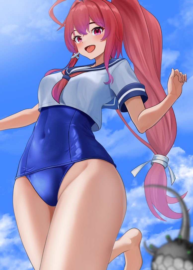 1girl blue_one-piece_swimsuit blue_sailor_collar blue_sky covered_navel dorachan_r enemy_naval_mine_(kancolle) from_below i-168_(kancolle) kantai_collection looking_at_viewer old_school_swimsuit one-piece_swimsuit open_mouth ponytail red_eyes red_hair sailor_collar school_swimsuit school_uniform serafuku sky smile solo swimsuit tight_clothes tongue white_serafuku