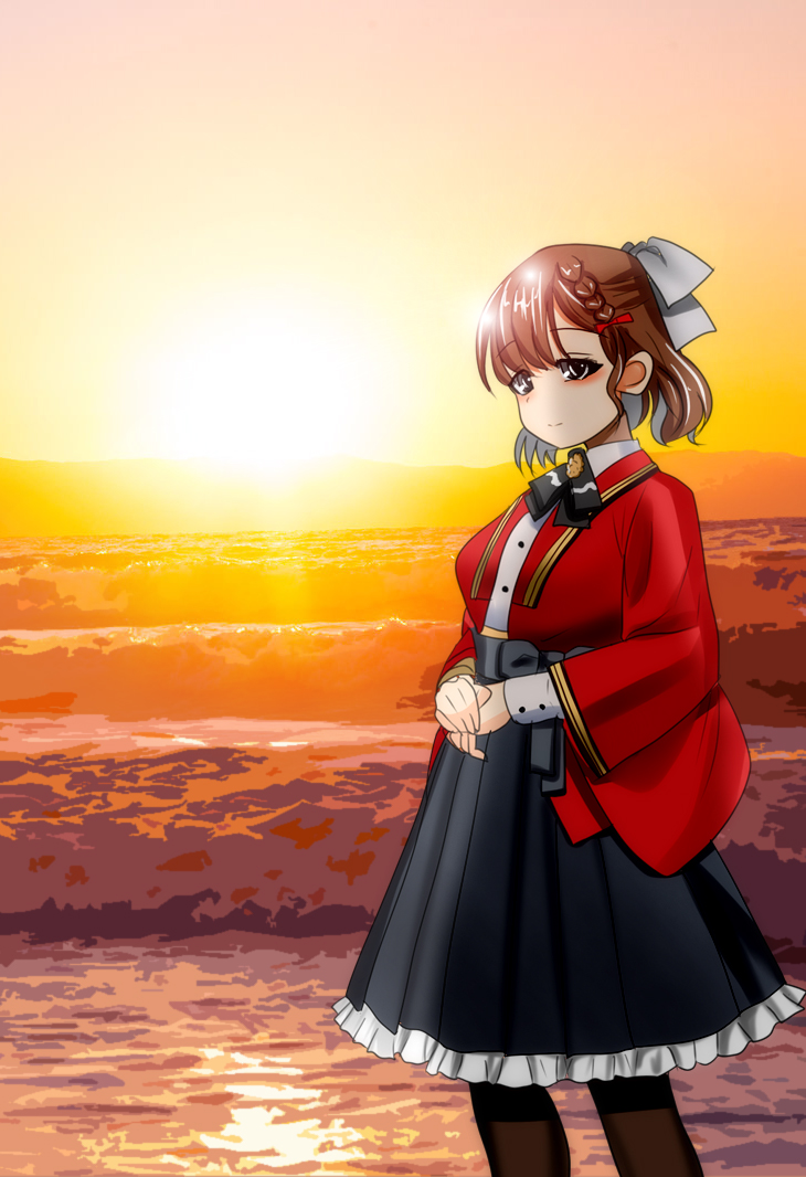 1girl asahi_(kancolle) black_hakama black_pantyhose bow braid brown_hair feet_out_of_frame grey_eyes hair_bow hakama japanese_clothes kantai_collection long_sleeves mikagami_kagari ocean outdoors pantyhose shirt short_hair side_braid solo standing sunset waves white_bow white_shirt wide_sleeves