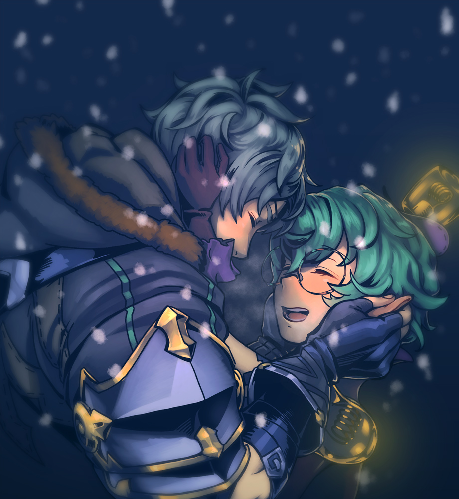1boy 1girl black_gloves closed_eyes coat eyepatch fingerless_gloves glasses gloves green_hair grey_coat grey_hair hetero jacket natto_soup night open_mouth outdoors pandoria_(xenoblade) pointy_ears purple_gloves purple_jacket short_hair sky smile snowing teeth upper_body upper_teeth_only xenoblade_chronicles_(series) xenoblade_chronicles_2 zeke_von_genbu_(xenoblade)