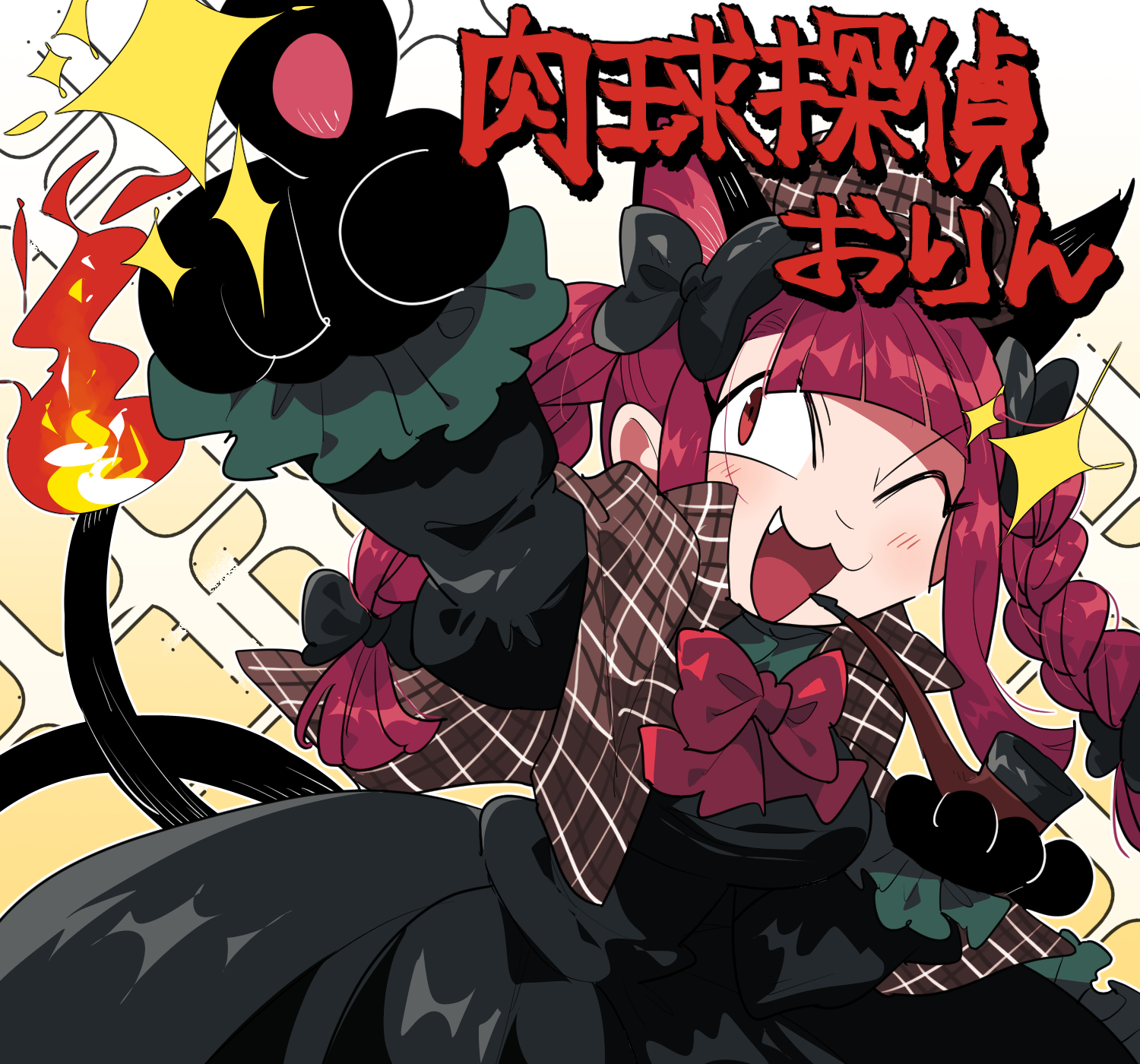 1girl :3 :d animal_ears animal_hands black_bow black_dress blunt_bangs bow braid cat_ears cat_paws cat_tail commentary_request dress extra_ears fang furukawa_(yomawari) hair_bow highres juliet_sleeves kaenbyou_rin long_hair long_sleeves multiple_tails nekomata one_eye_closed open_mouth pointing puffy_sleeves red_hair side_braids smile solo tail touhou twin_braids two_tails upper_body