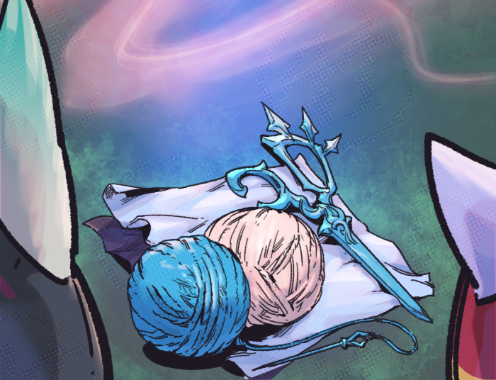 2girls animal_ears commentary english_commentary gwen_(league_of_legends) league_of_legends lulu_(league_of_legends) multicolored_background multiple_girls needle object_focus phantom_cross scissors sewing_needle vex_(league_of_legends) yarn yarn_ball
