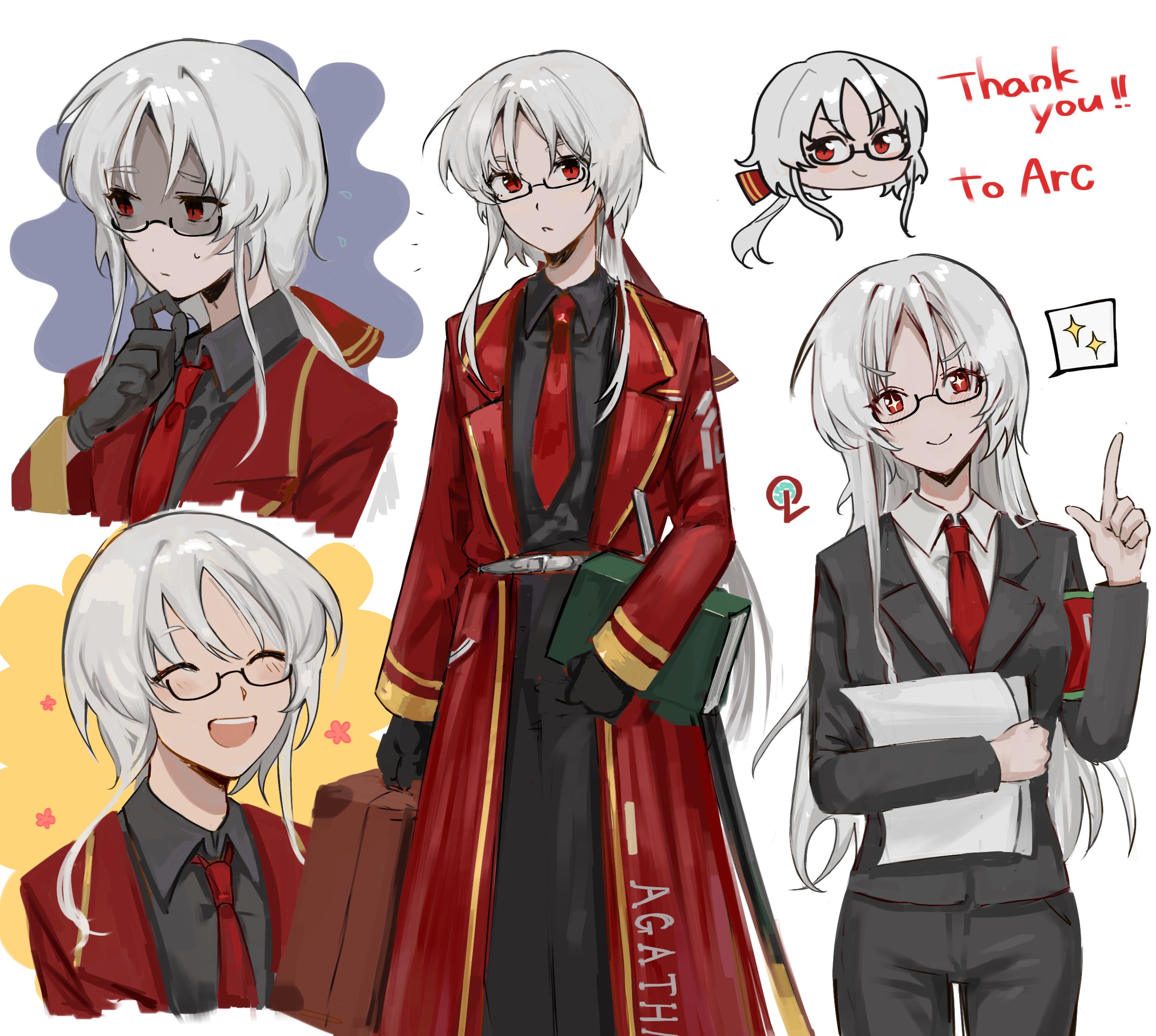 1girl armband black_jacket black_shirt blush bow coat collared_shirt cosplay dante_(limbus_company) dante_(limbus_company)_(cosplay) glasses hair_bow happy highres jacket limbus_company lobotomy_corporation long_hair long_sleeves malkuth_(project_moon) malkuth_(project_moon)_(cosplay) multiple_views na-gyou_(nunumaru) necktie original project_moon red_bow red_coat red_necktie shaded_face shirt smile sparkle very_long_hair white_hair white_shirt