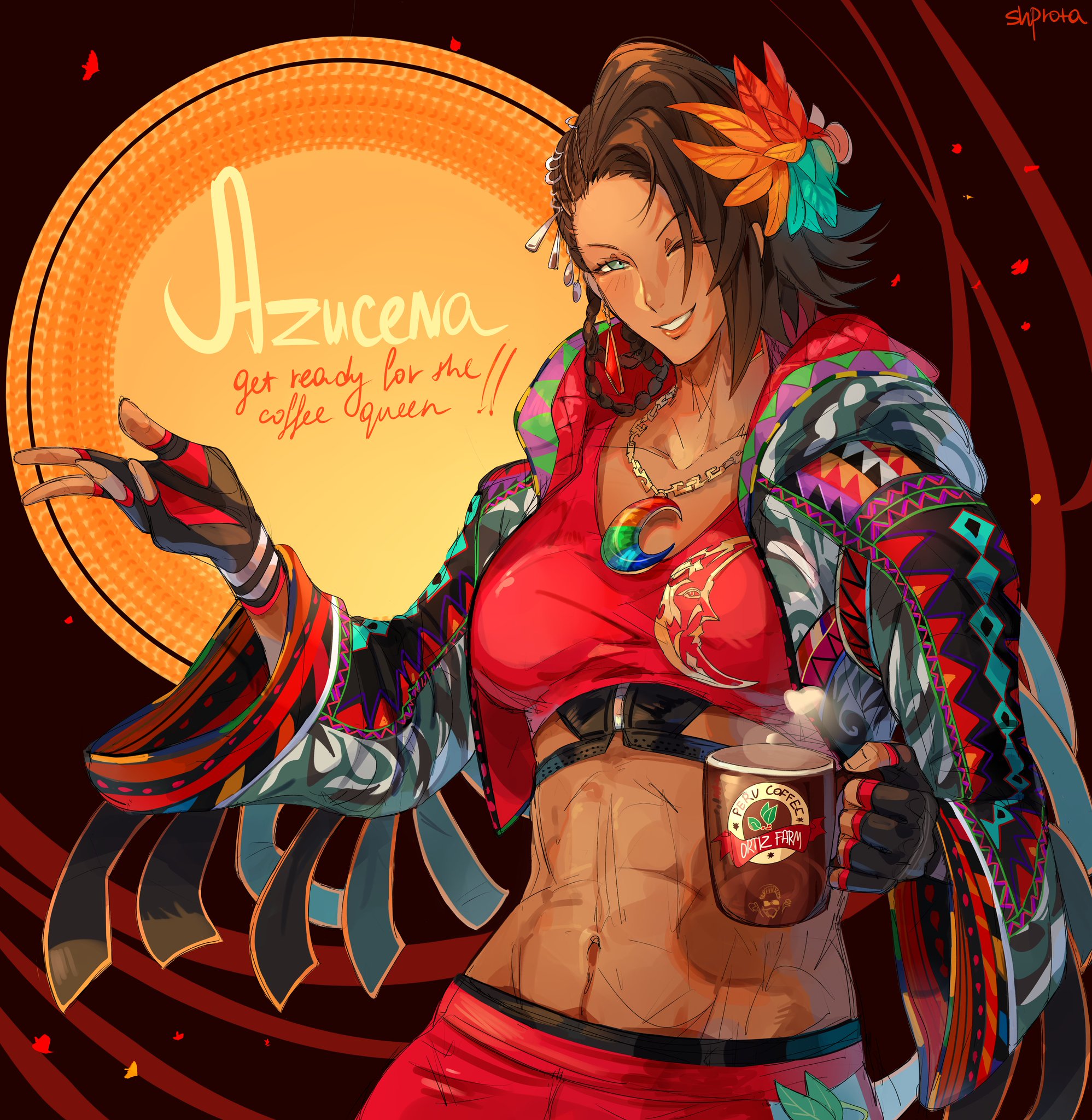 1girl abs azucena_milagros_ortiz_castillo breasts coffee coffee_mug crop_top cup dark-skinned_female dark_skin fingerless_gloves gloves highres jacket large_breasts long_hair long_sleeves looking_at_viewer mug one_eye_closed pants peruvian_female shpr0ta tekken tekken_8 wink