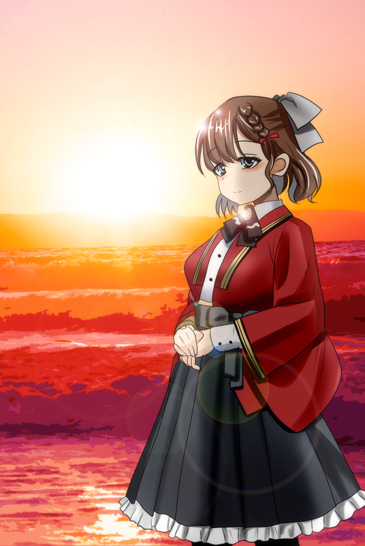 1girl asahi_(kancolle) black_hakama black_pantyhose braid brown_hair coat collared_shirt grey_eyes hair_ribbon hakama japanese_clothes kantai_collection lens_flare long_sleeves looking_at_viewer mikagami_kagari mole mole_under_mouth pantyhose red_coat ribbon shirt short_hair single_braid solo standing sunset water white_ribbon white_shirt