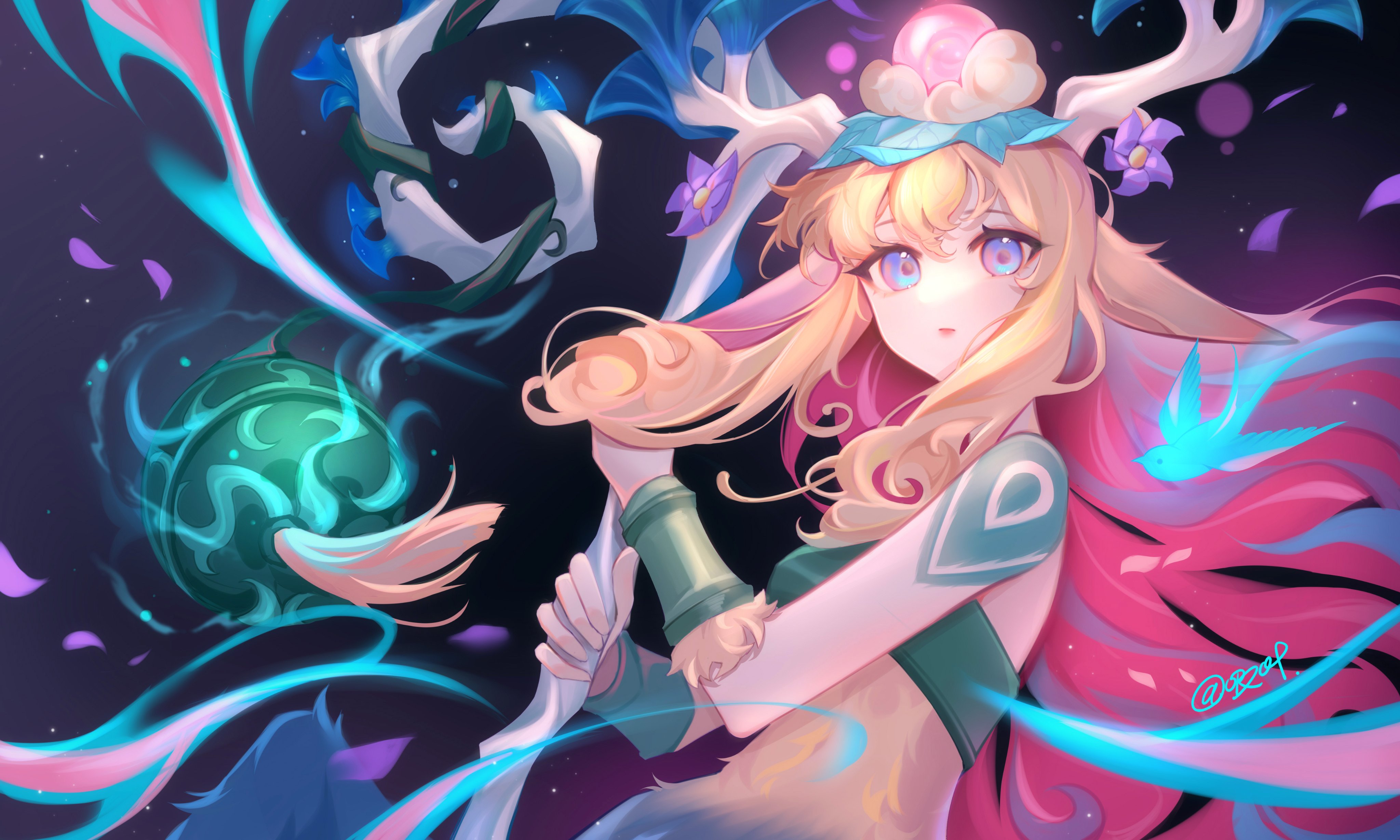 1girl absurdres animal_ears antlers bare_shoulders bird blonde_hair blue_eyes breasts closed_mouth colored_skin flower hair_between_eyes hair_flower hair_ornament highres holding holding_staff horns horse_ears league_of_legends lillia_(league_of_legends) long_hair multicolored_hair purple_flower shan_hai_scrolls_lillia small_breasts solo staff taur xi_ye_(xiyexiexie)