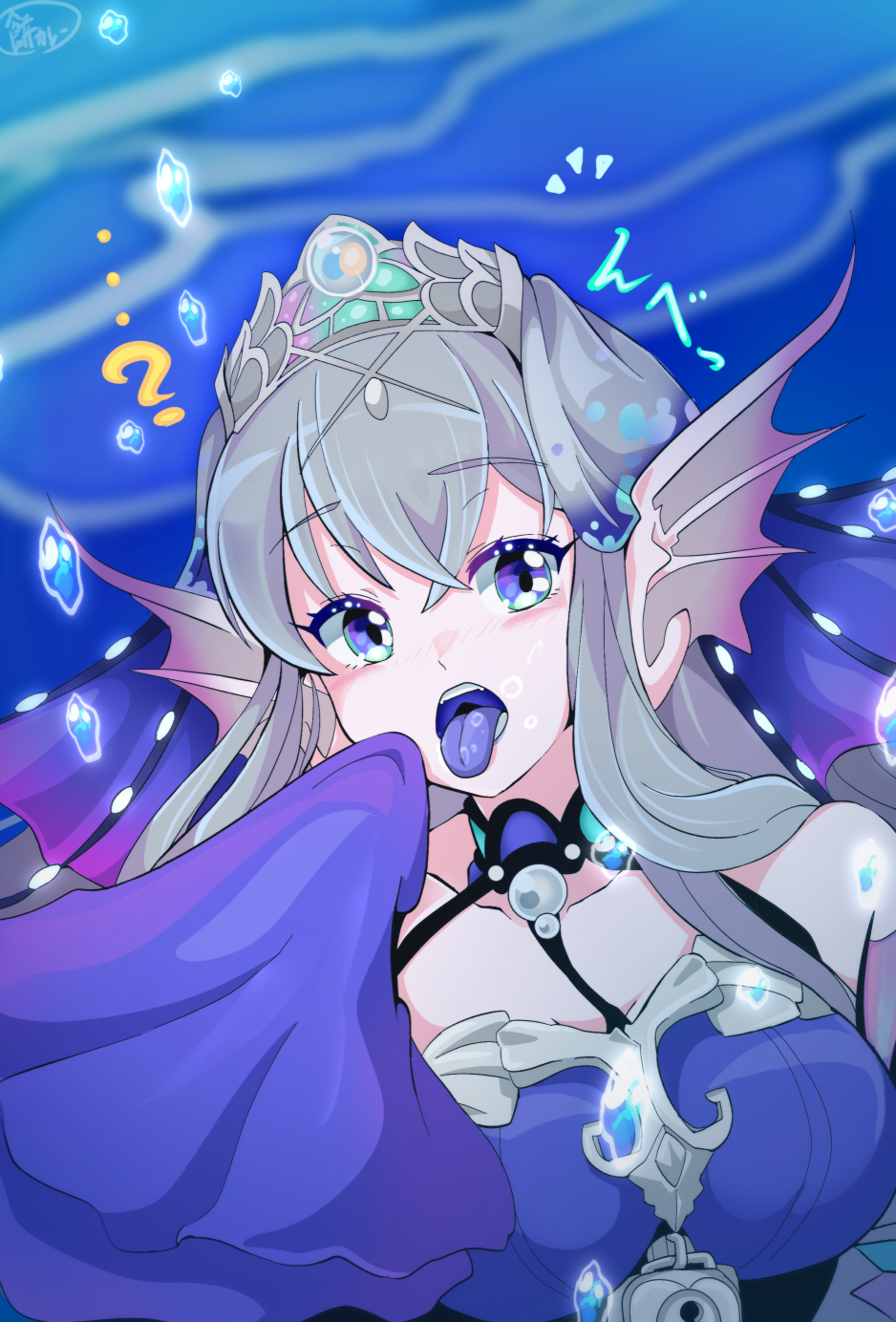 ...? 1girl bare_shoulders blue_tongue breasts collarbone colored_tongue dress duel_monster fins grey_hair head_fins highres kitkallos_(yu-gi-oh!) large_breasts lock long_sleeves mochi_curry open_mouth padlock purple_eyes siren_(mythology) sleeves_past_fingers sleeves_past_wrists solo tearlaments_kitkallos tiara tongue tongue_out underwater upper_body yu-gi-oh!