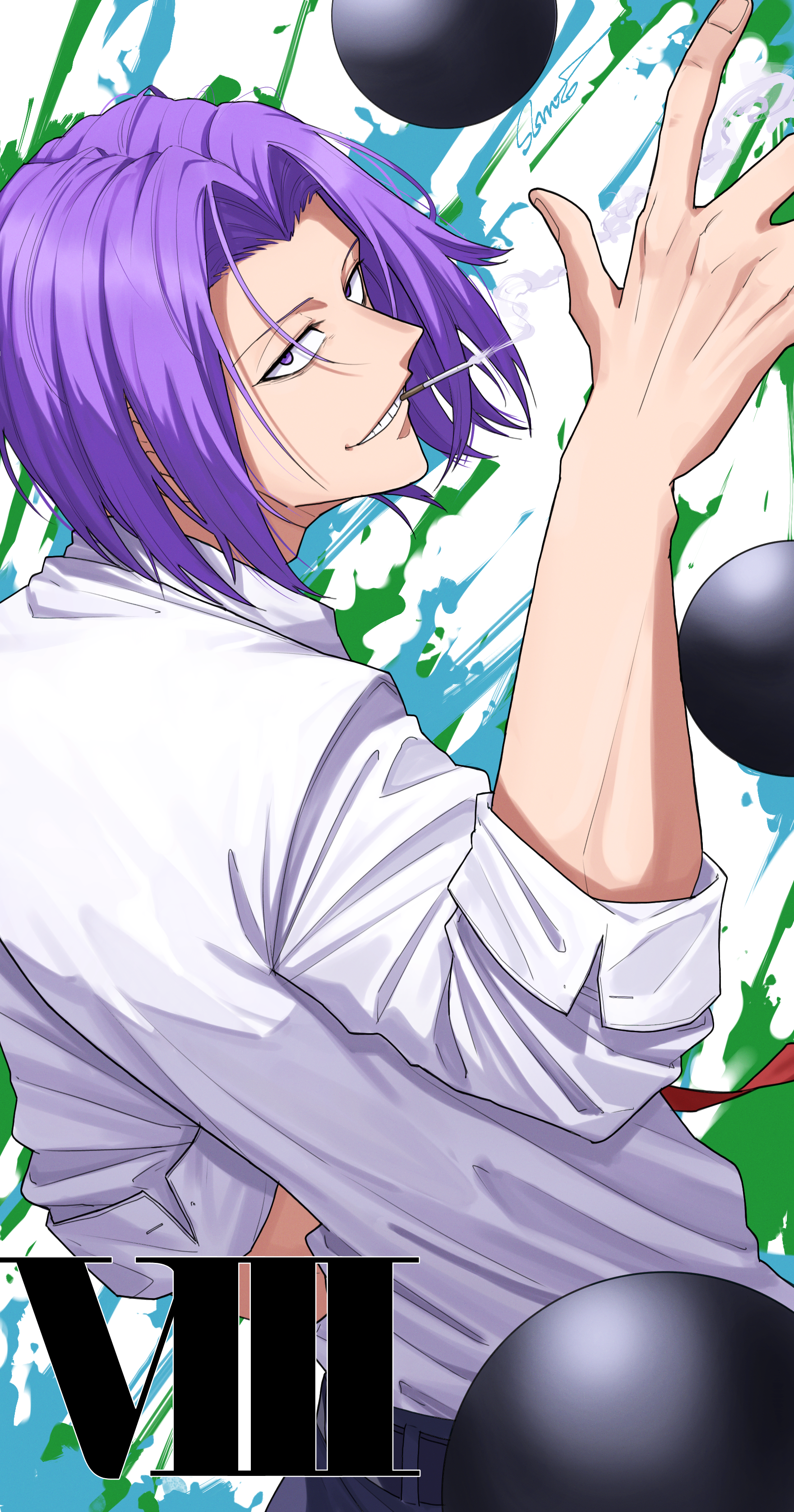 1boy absurdres artist_name cigarette grin highres male_focus medium_hair mouth_hold necktie nico_vorgeil orb purple_eyes purple_hair red_necktie shirt shishiruto smile smoking solo teeth_hold undead_unluck white_shirt