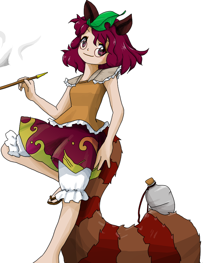 1girl animal_ears blush_stickers brown_eyes brown_hair brown_shirt brown_skirt closed_mouth futatsuiwa_mamizou glasses holding holding_smoking_pipe leaf leaf_on_head non-web_source official_art raccoon_ears raccoon_tail round_eyewear shirt short_hair skirt smile smoking_pipe solo tail touhou transparent_background unfinished_dream_of_all_living_ghost zun_(artist)