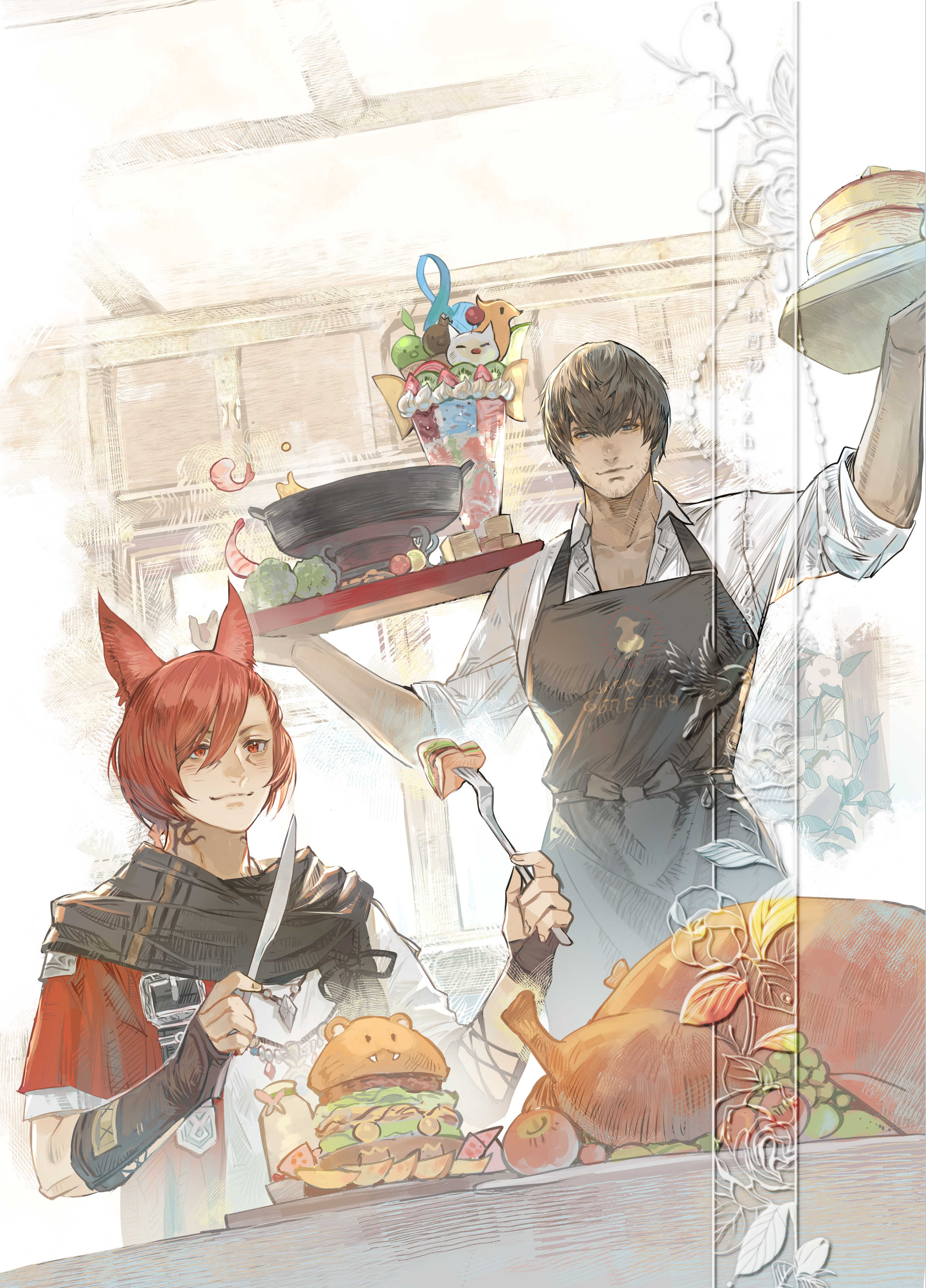 2boys absurdres adventurer_(ff14) animal_ears apron beard_stubble black_apron black_scarf blue_eyes brown_gloves brown_hair burger cat_ears chicken_(food) collared_shirt day dutch_angle elbow_gloves facial_hair facial_mark final_fantasy final_fantasy_xiv fingerless_gloves food fork fruit g'raha_tia gloves highres holding holding_fork holding_knife holding_tray hyur indoors jacket jewelry jushenger knife leaf male_focus miqo'te multiple_boys neck_tattoo pancake parfait pendant plate red_eyes red_hair red_jacket scarf shirt short_hair shoulder_belt shrimp sitting slit_pupils smile standing stubble swept_bangs tattoo tray uniform upper_body waiter warrior_of_light_(ff14) white_shirt